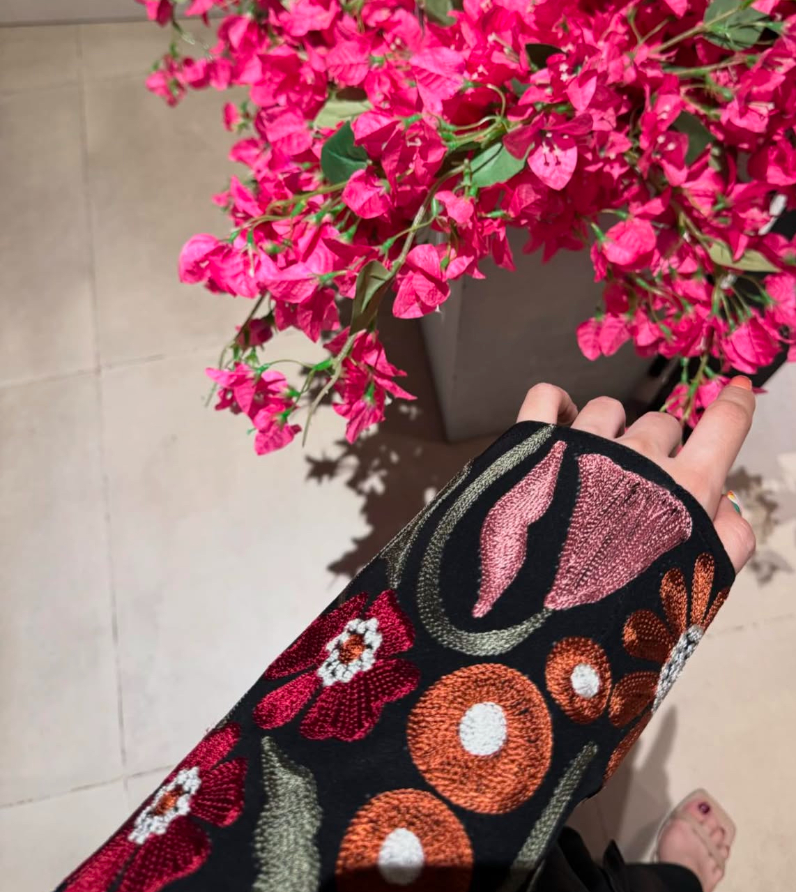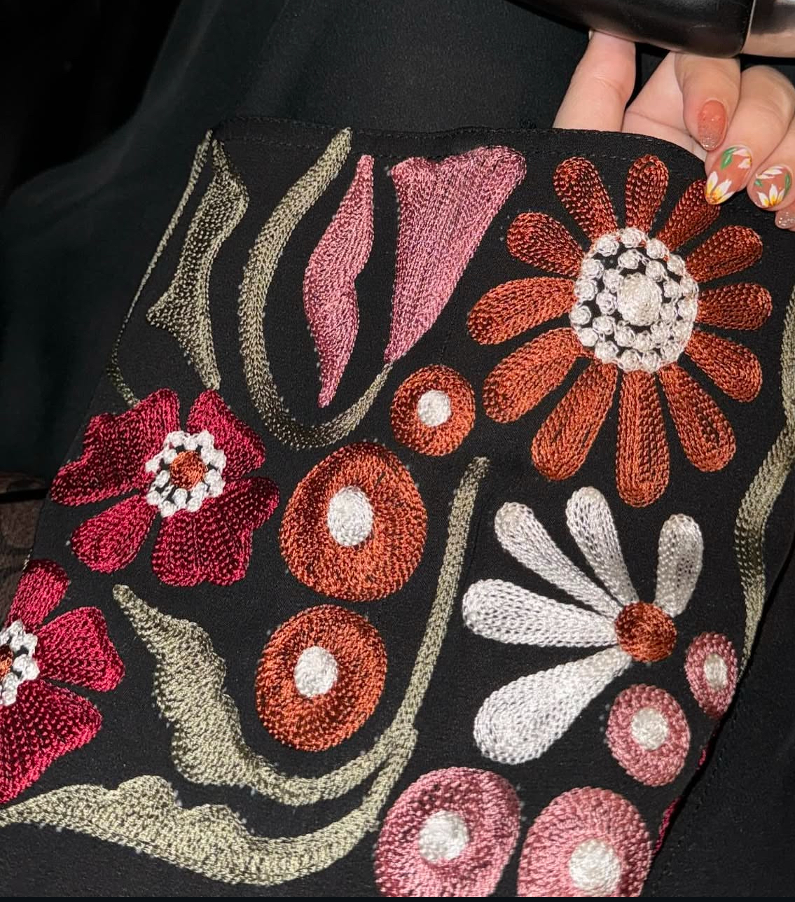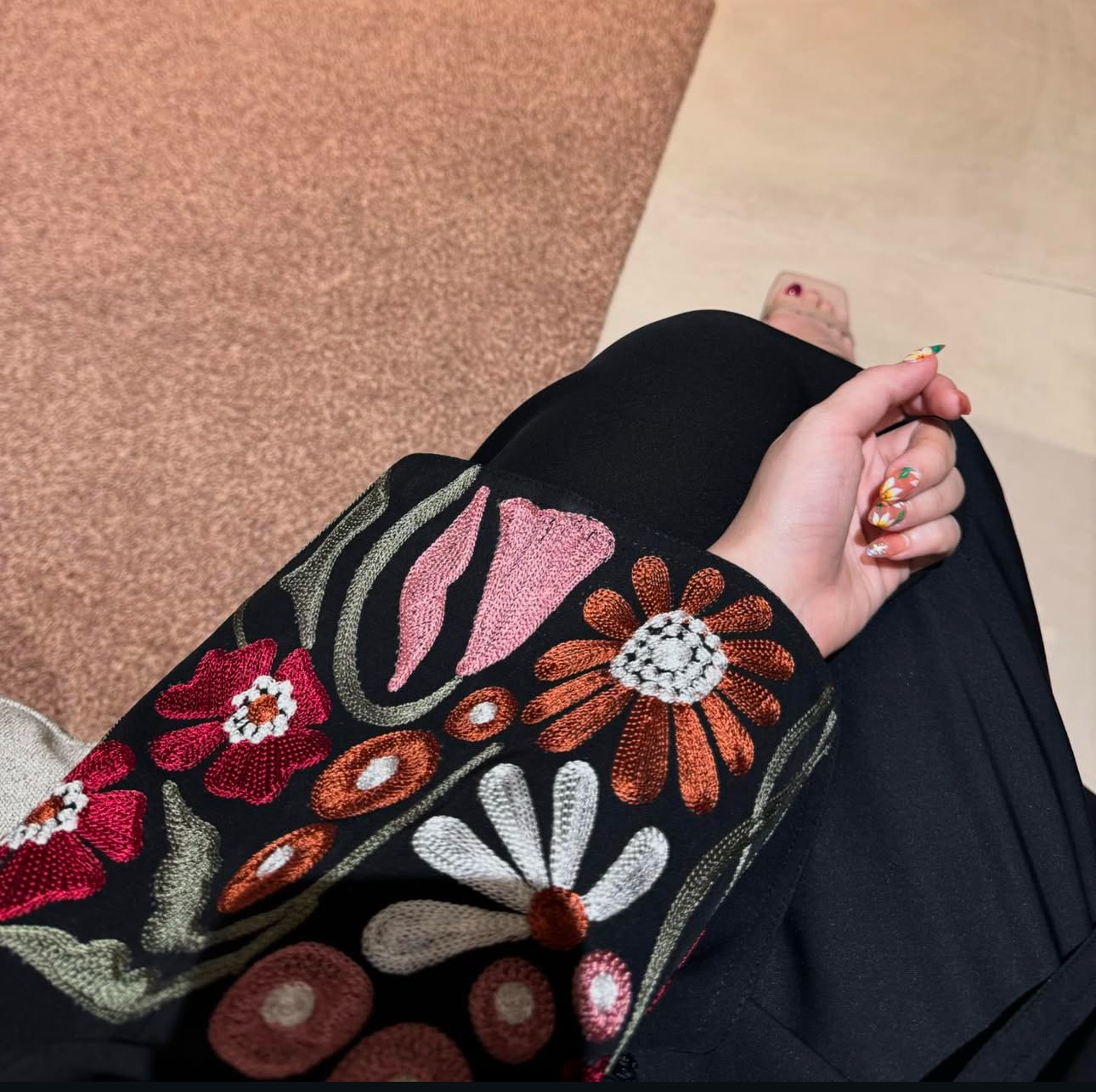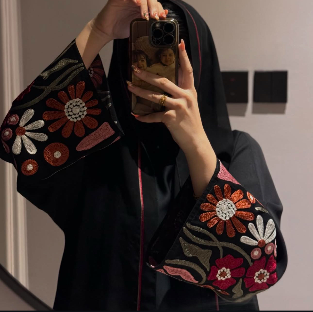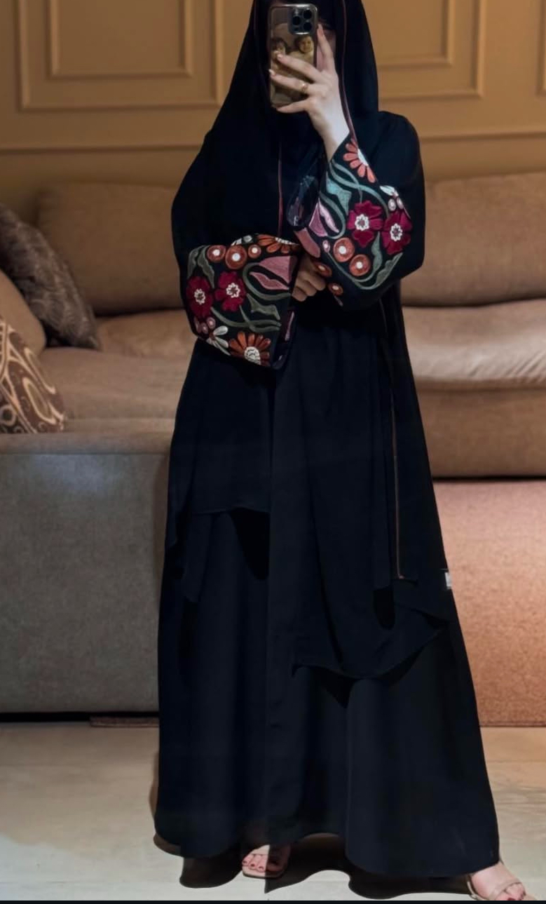 The Autumn Glow Abaya features a stunning blend of burnt orange, red, white, and dusty pink flowers, complemented by, dull green leaf embroidery on the sleeves. The vibrant floral design brings a touch of warmth and color, while the delicate leaf work adds an earthy, natural feel. Made from premium fabric, this abaya is perfect for those seeking a unique and elegant piece for special occasions or everyday wear.