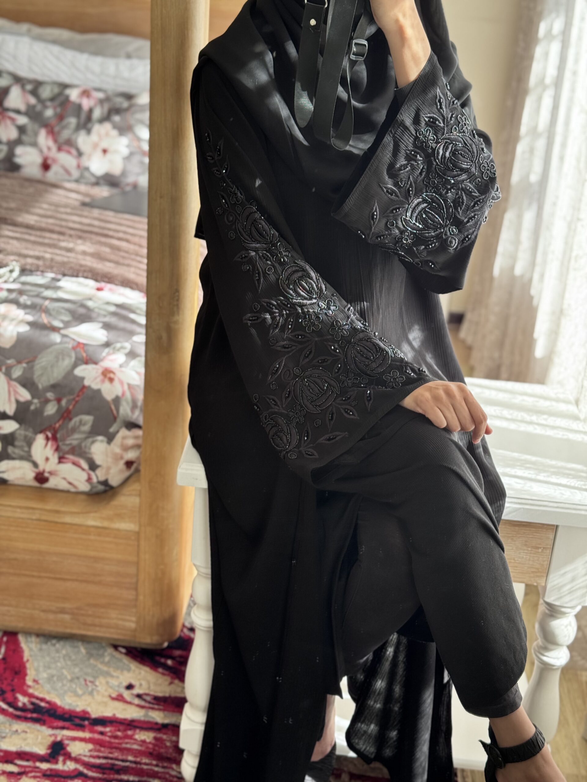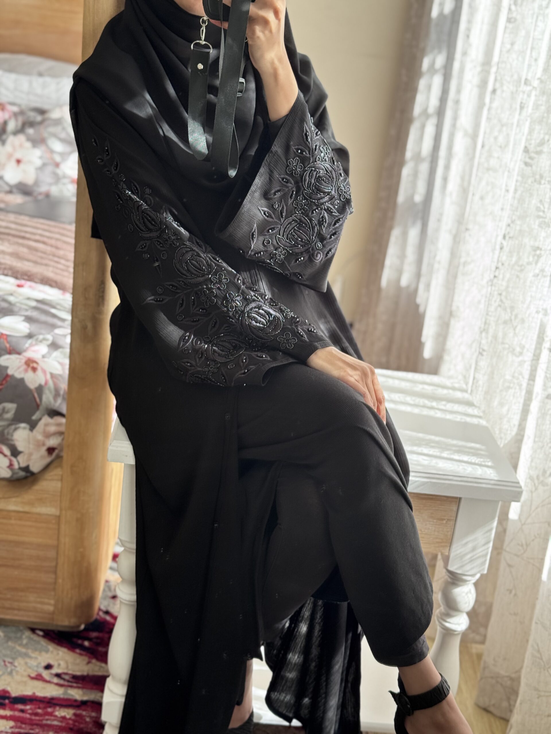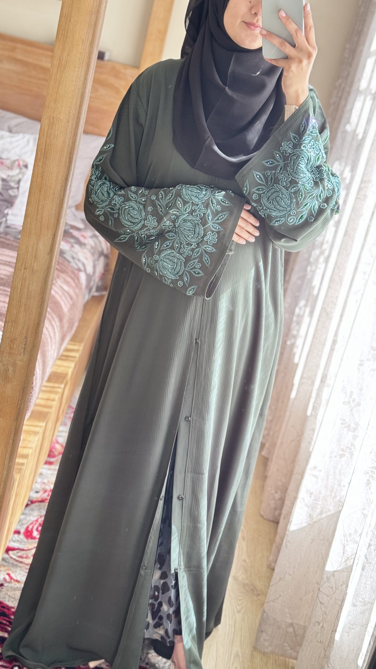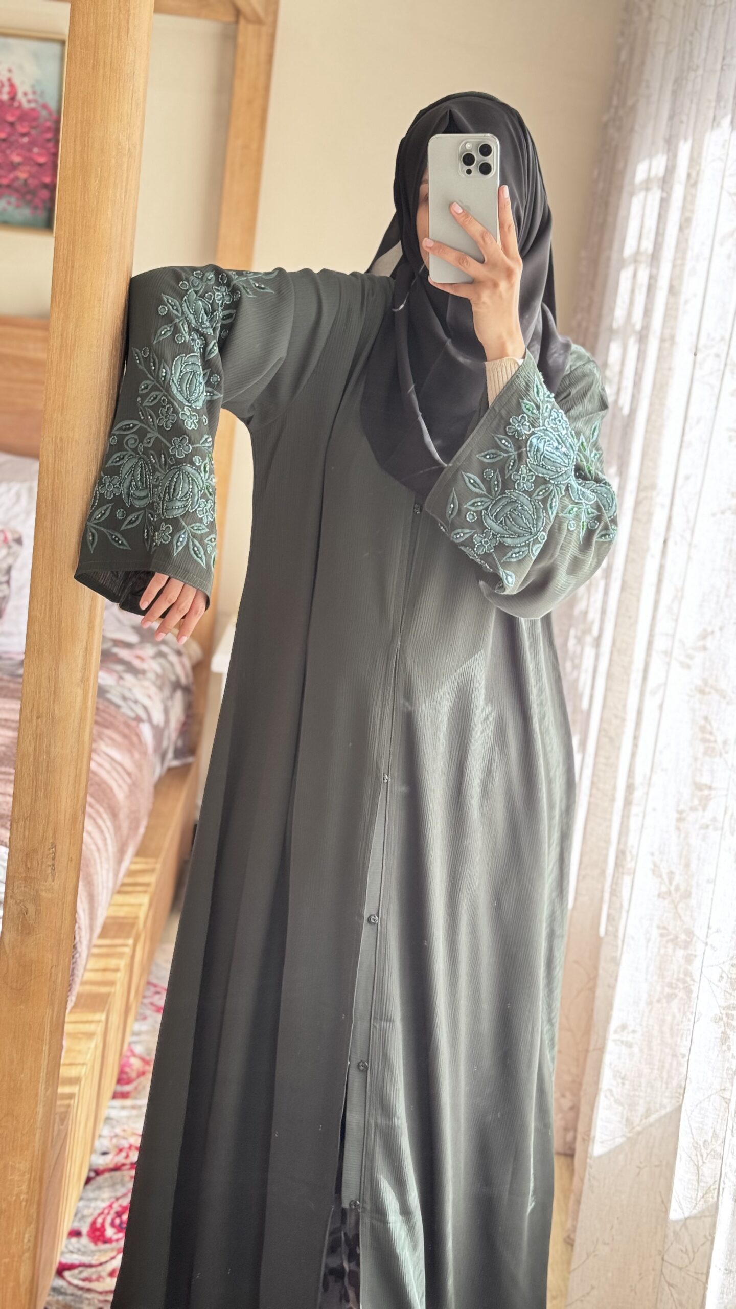 Stunning zoom fabric abaya with intricate embroidery and hand work. Available in 3 beautiful colours. comes with matching scarf.
