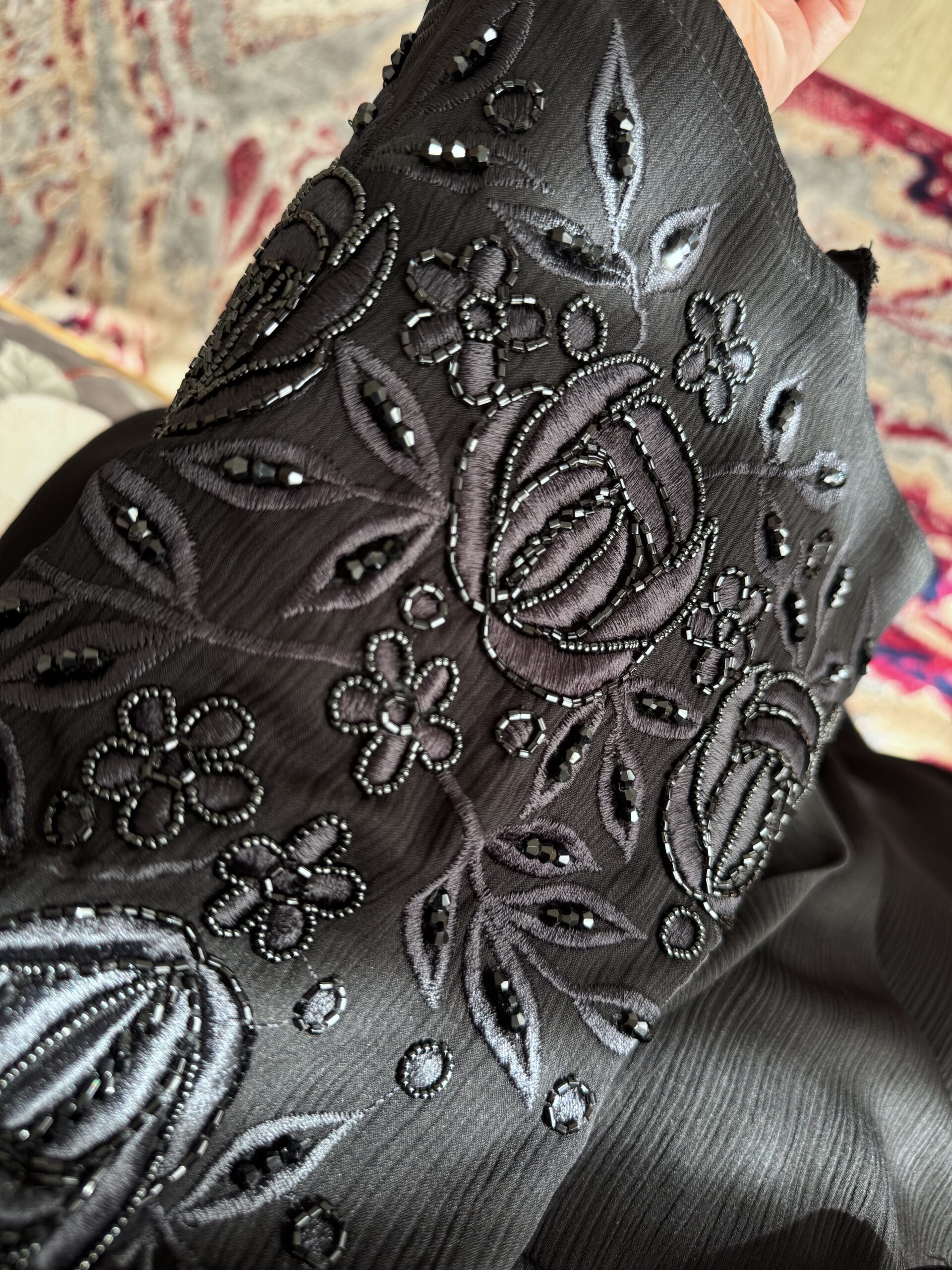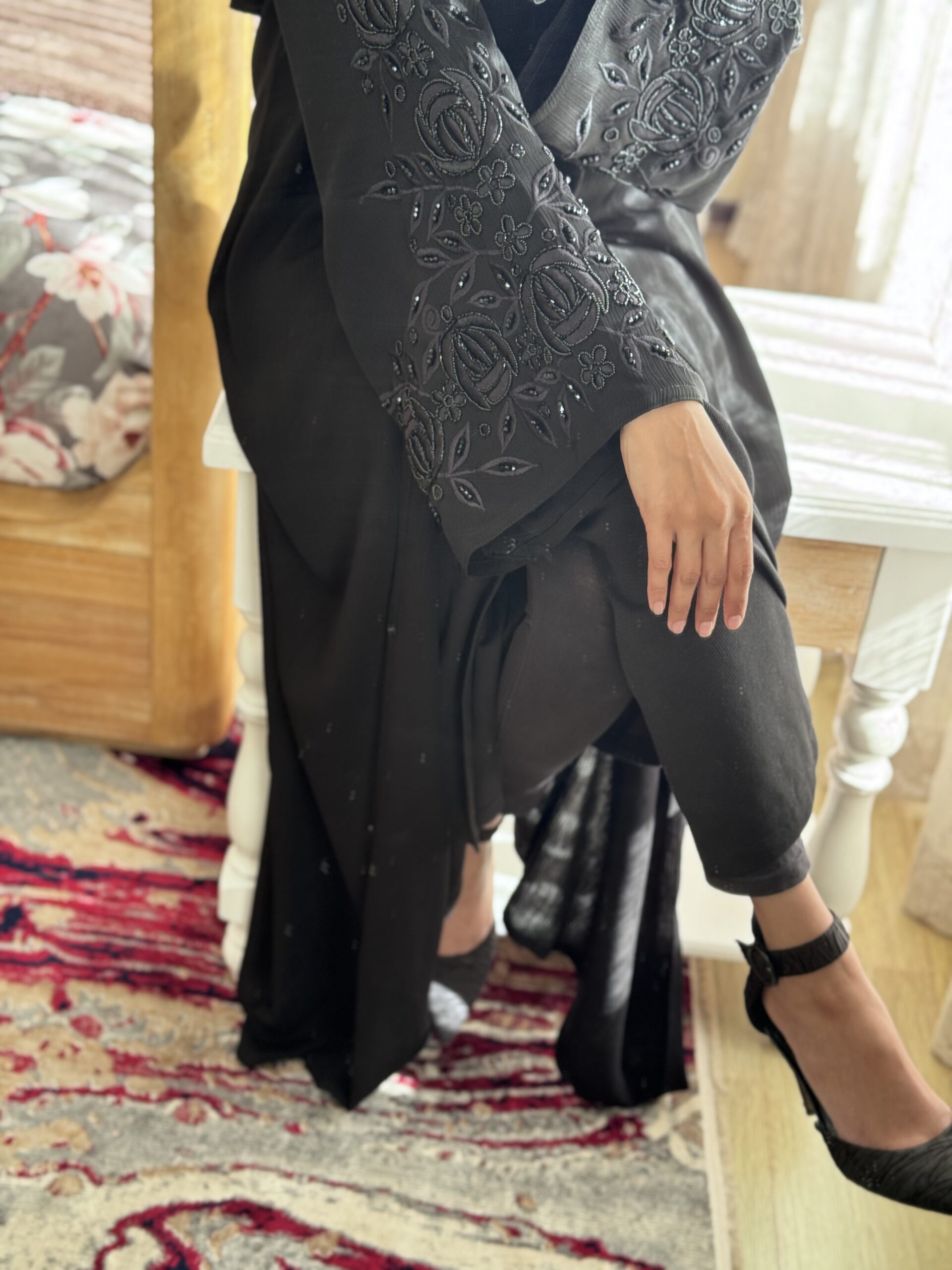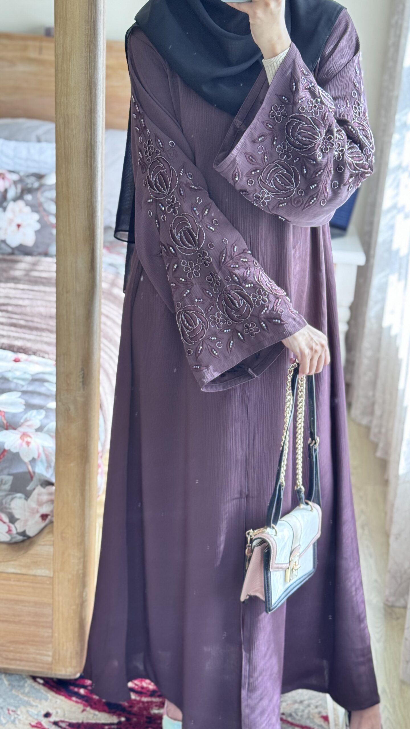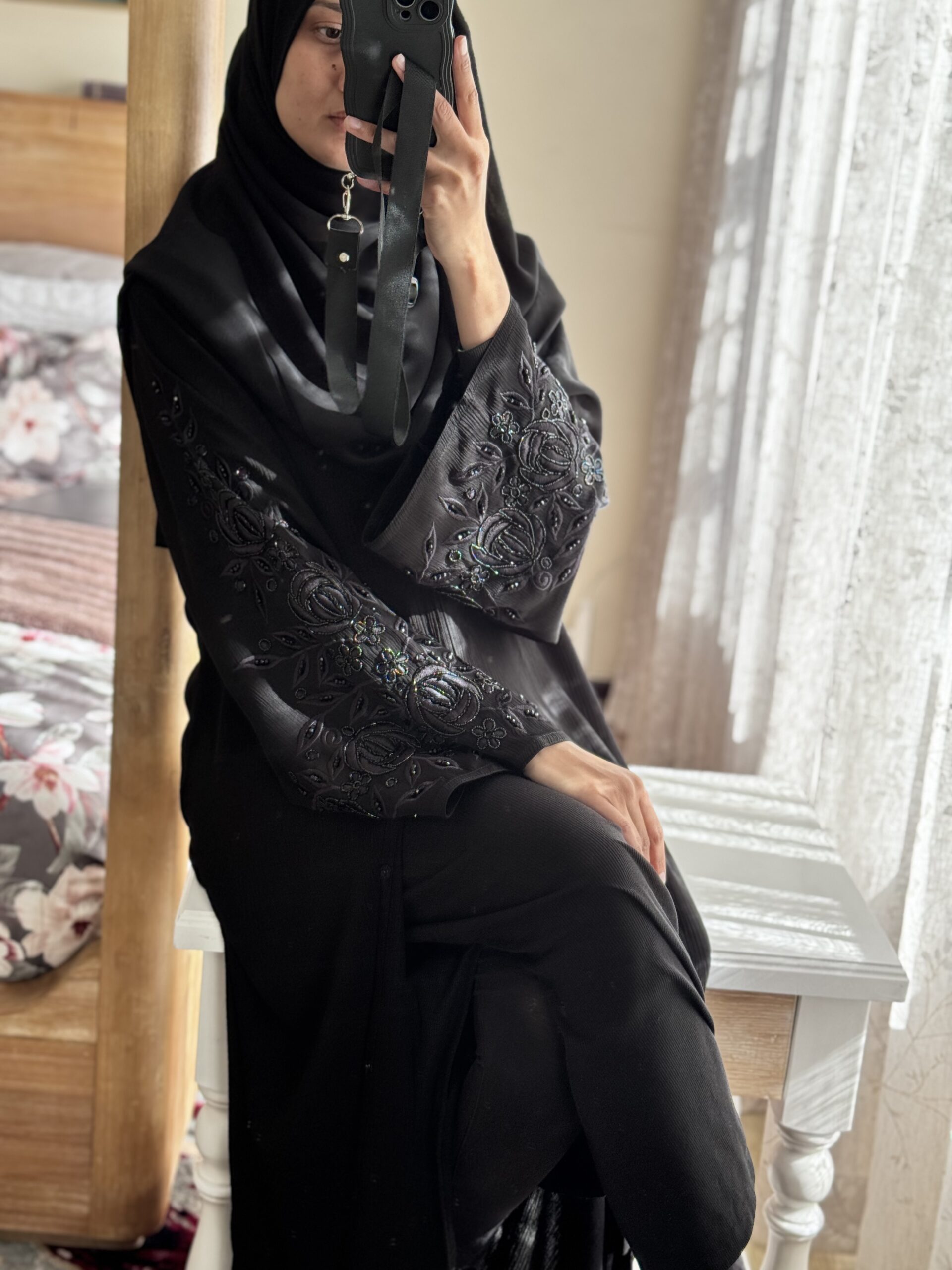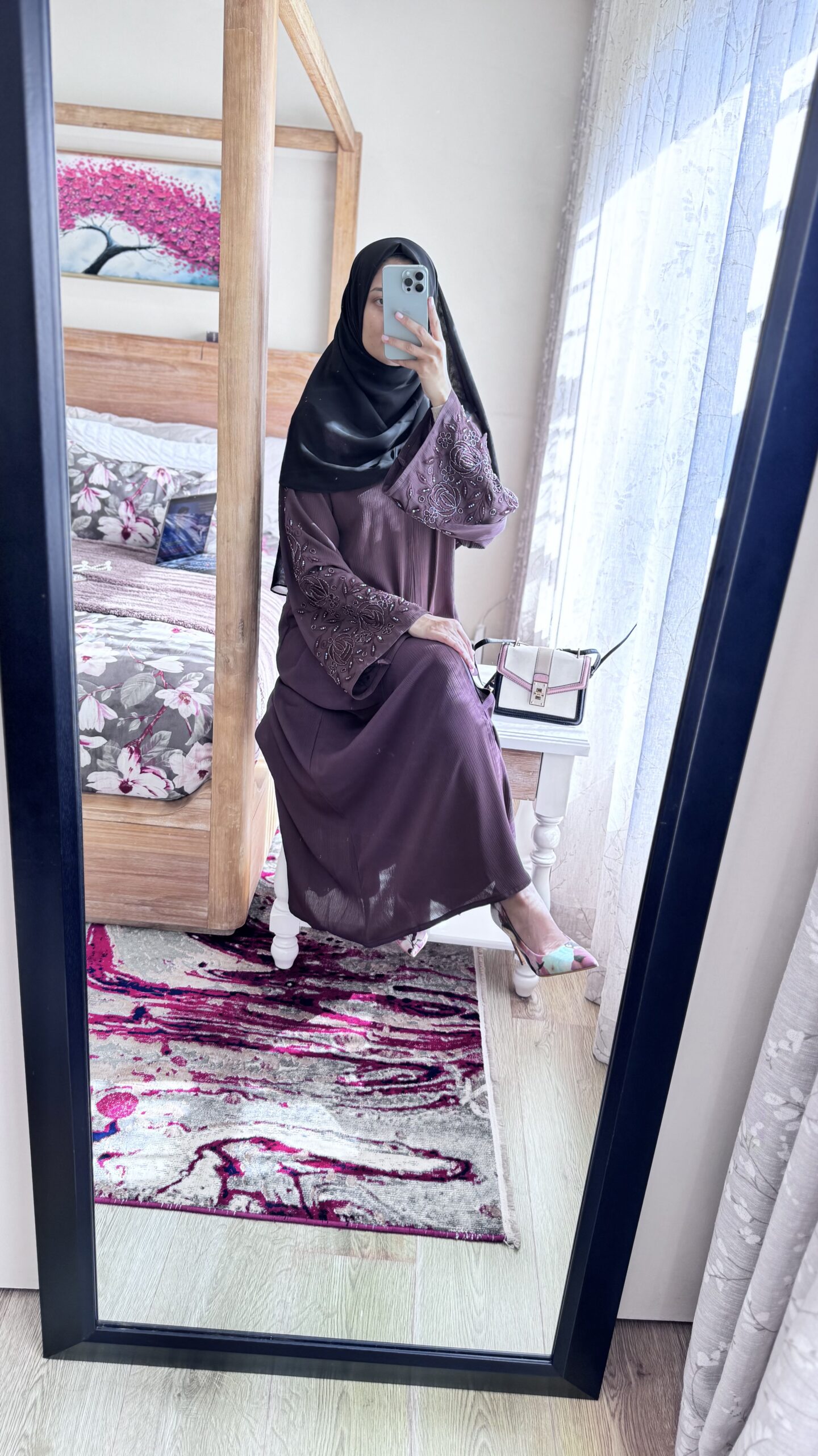 Stunning zoom fabric abaya with intricate embroidery and hand work. Available in 3 beautiful colours. comes with matching scarf.