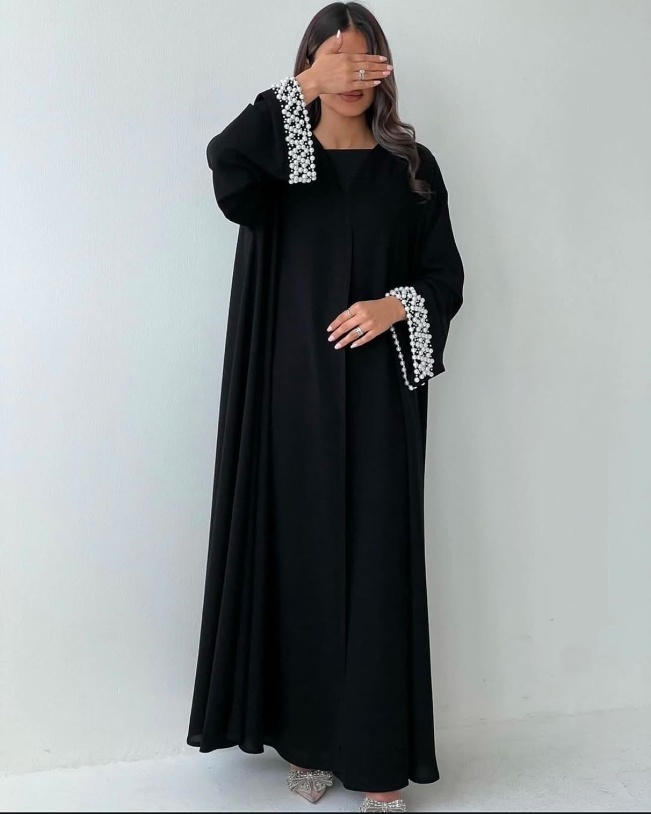 The Amara Abaya offers a refined elegance, crafted from black Nida fabric with delicate pearl beadwork around the wrists. The understated pearls add a touch of sophistication, perfect for those who appreciate subtle beauty. Ideal for Iftaar or any special gathering, this abaya combines simplicity with a hint of luxury for a graceful and timeless look.