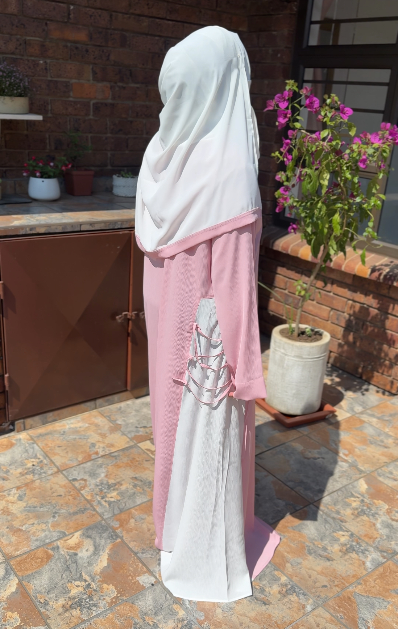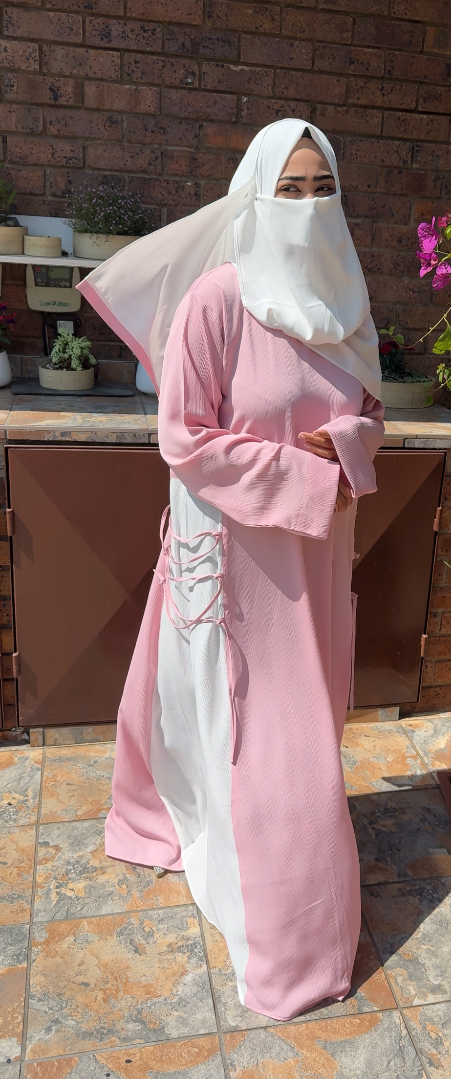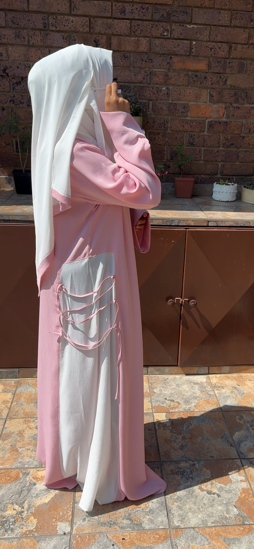 🌸 “This piece is called Blush Cloud — a simple baby pink abaya with crisp white side panels, creating a fresh, airy contrast. The belt detail adds the option of a fitted, dress-like silhouette, keeping the look graceful yet versatile.”