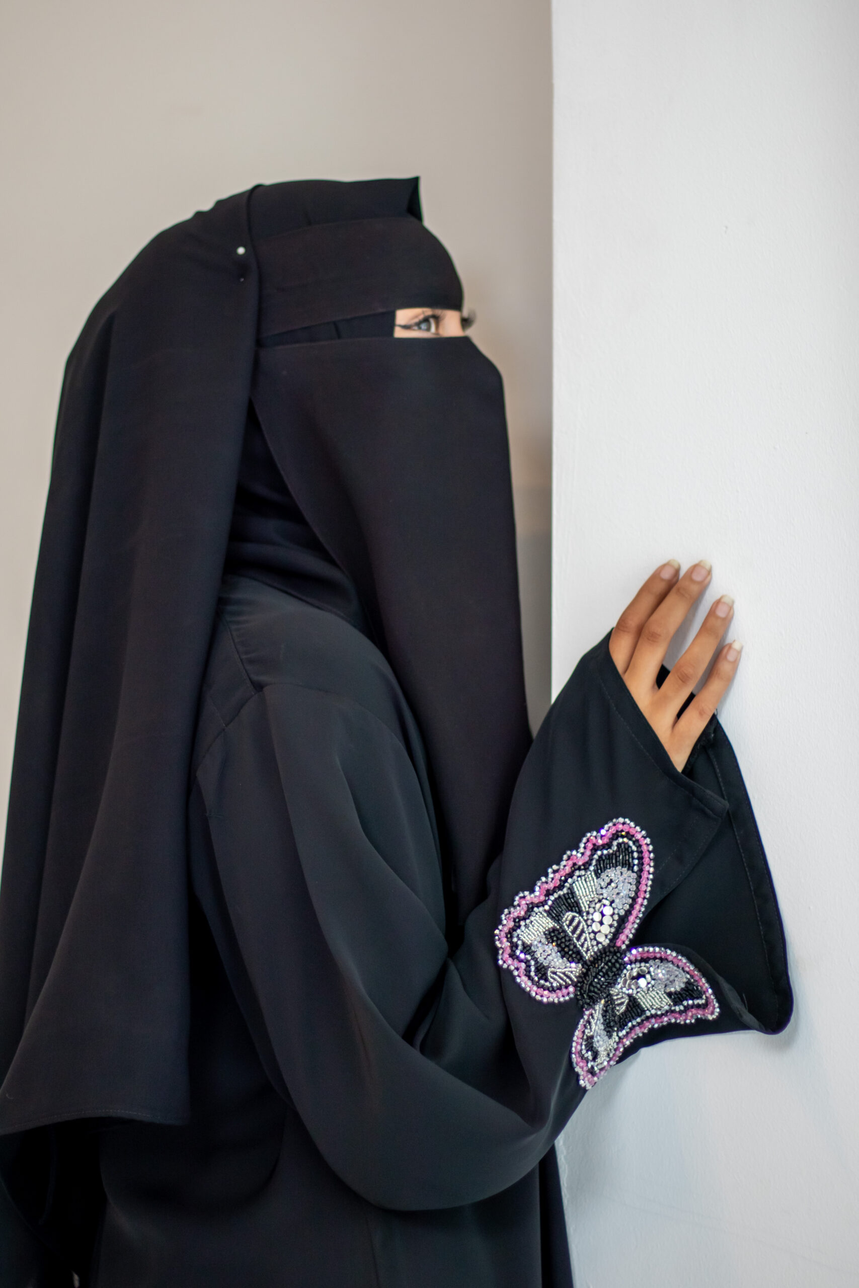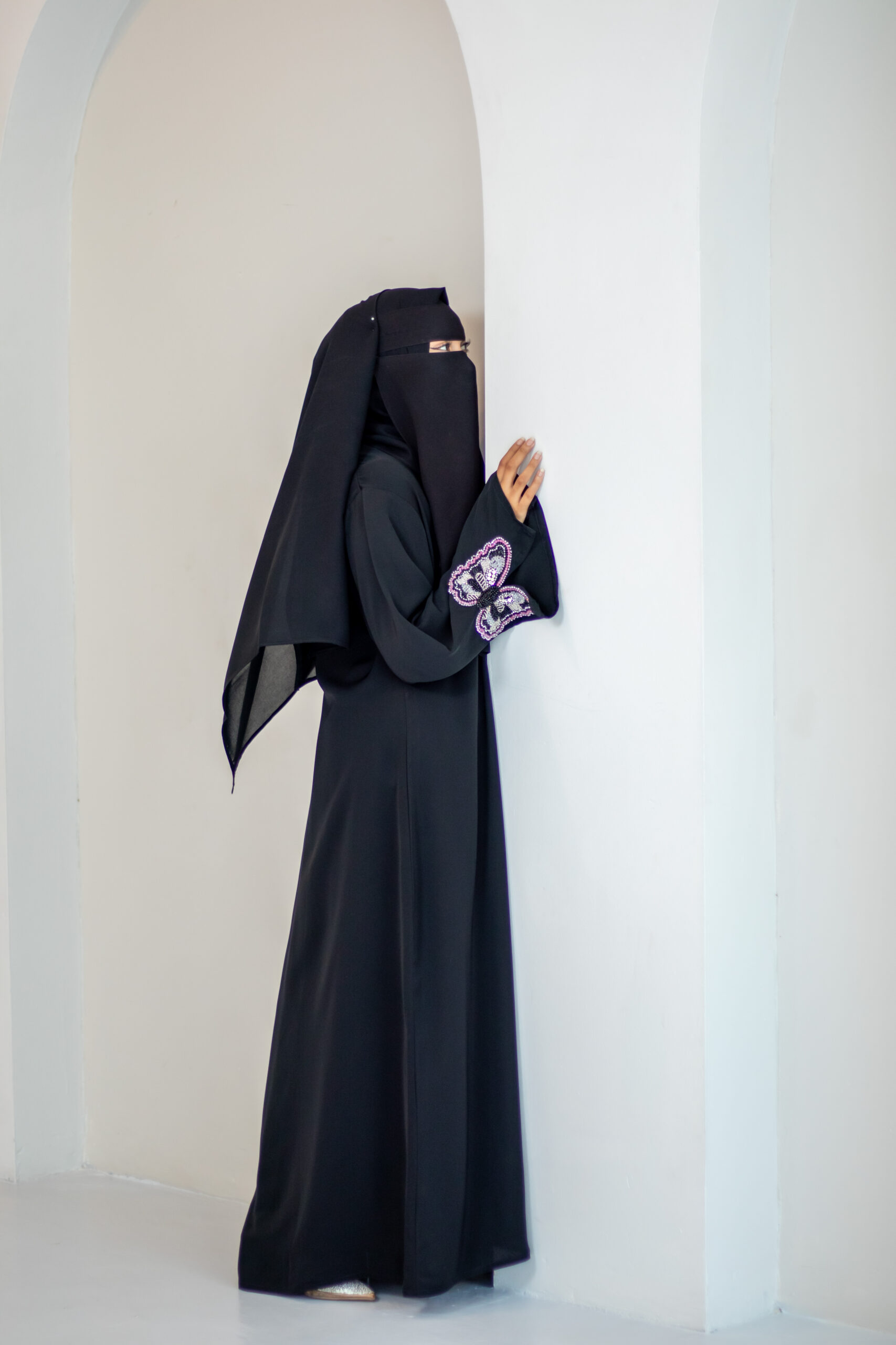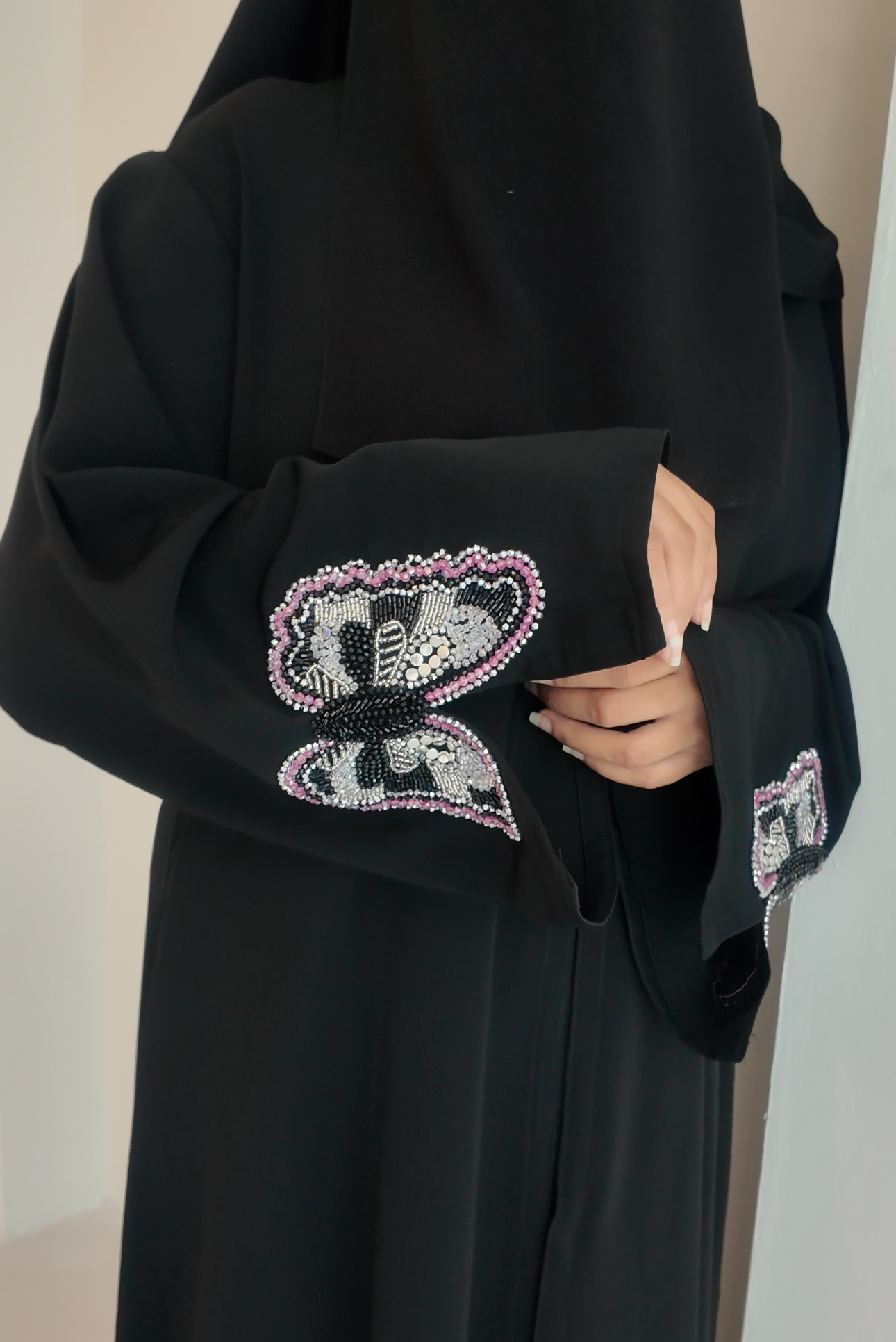 Premium Nida abaya with stunning handwork on the sleeves.