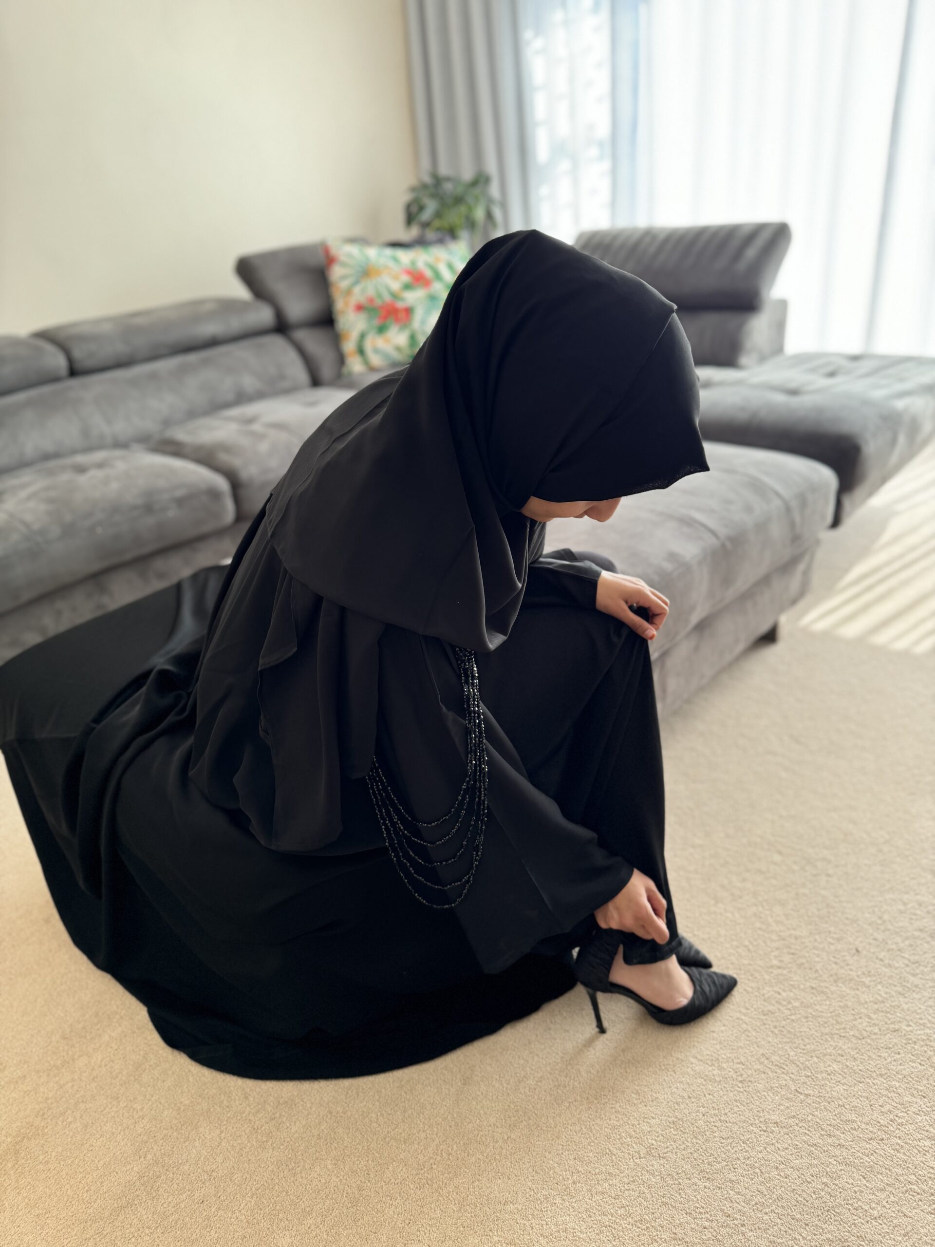 A sleek black abaya featuring subtle black-on-black beadwork on the shoulders. Four beaded strings in a rounded shape hang elegantly, allowing the arms to pass through. This versatile piece can be worn in two unique ways, combining simplicity and elegance effortlessly.