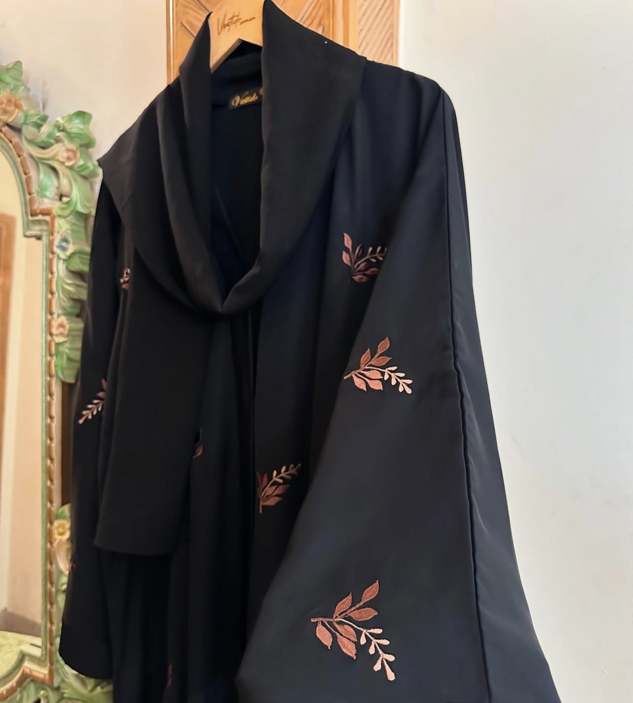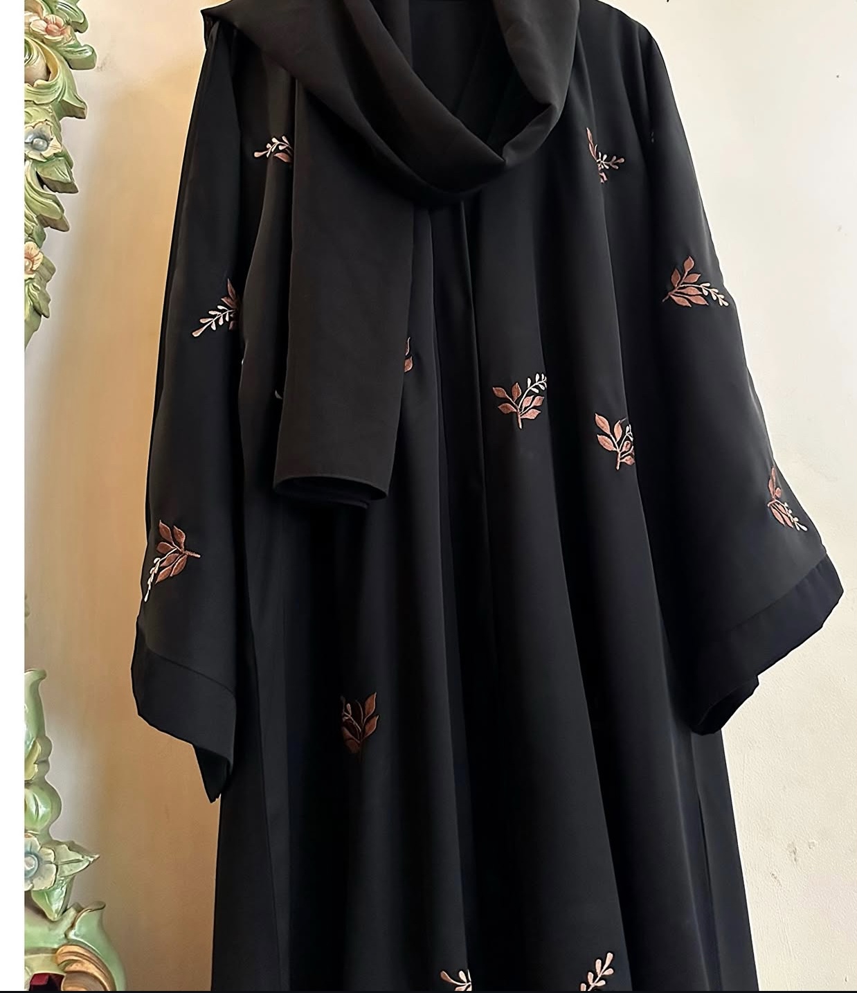 The Ember Abaya features a unique design with small, carefully spaced leaves embroidered across the front in a stunning black-on-bronzy brown color combination. The subtle, nature-inspired motif brings a touch of elegance and warmth, making it the perfect choice for those who love understated beauty with a twist. The rich tones of this abaya create a striking look that’s ideal for special occasions or evening gatherings.