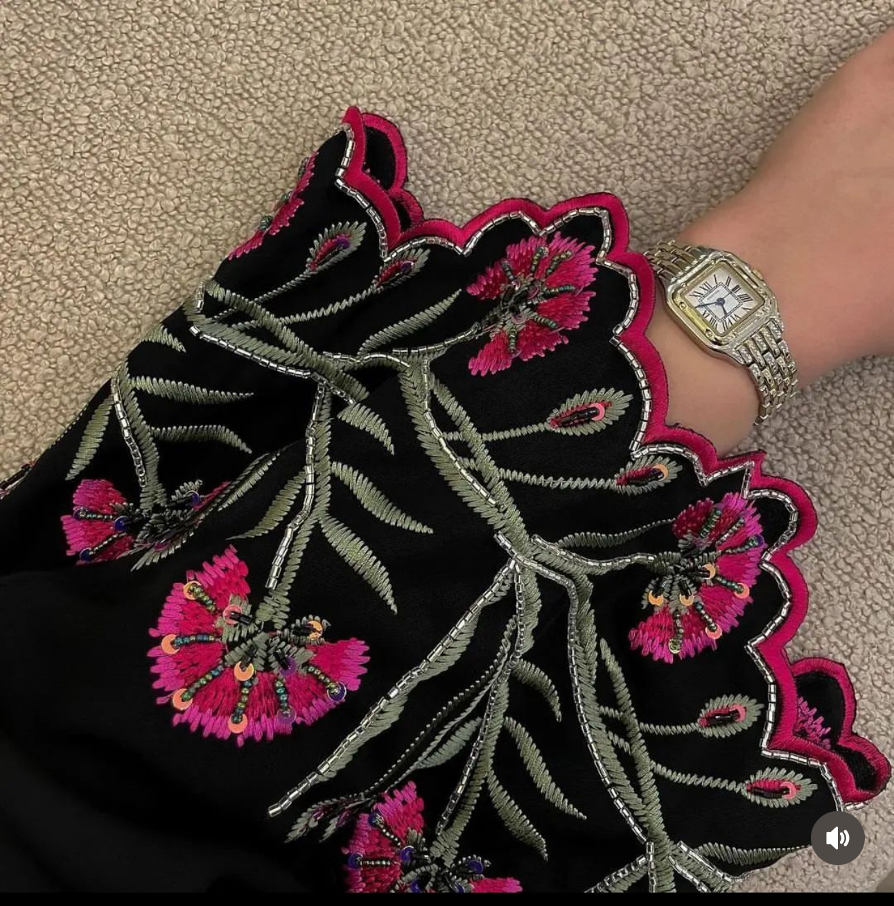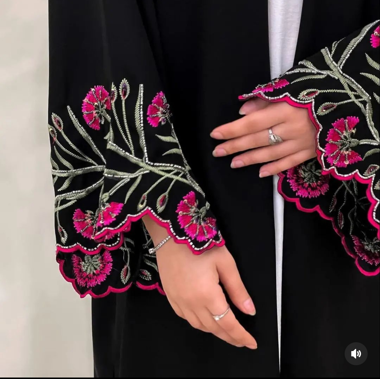 The Floral Harmony Abaya is crafted from luxurious Nida fabric in a timeless black hue. Its elegant simplicity is enhanced by exquisite embroidery of vibrant sari pink and rich reddish flowers, subtly accented with delicate green touches. Intricate green beads are embedded among the flower petals, adding a touch of sophistication and a hint of sparkle to this classic piece. Perfect for making a refined statement, this abaya seamlessly blends traditional elegance with modern flair.