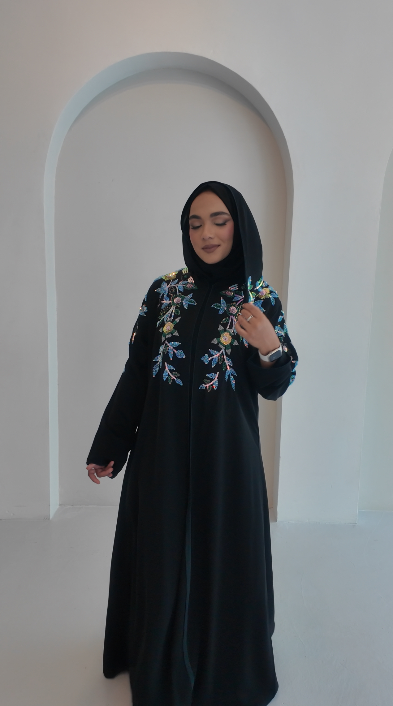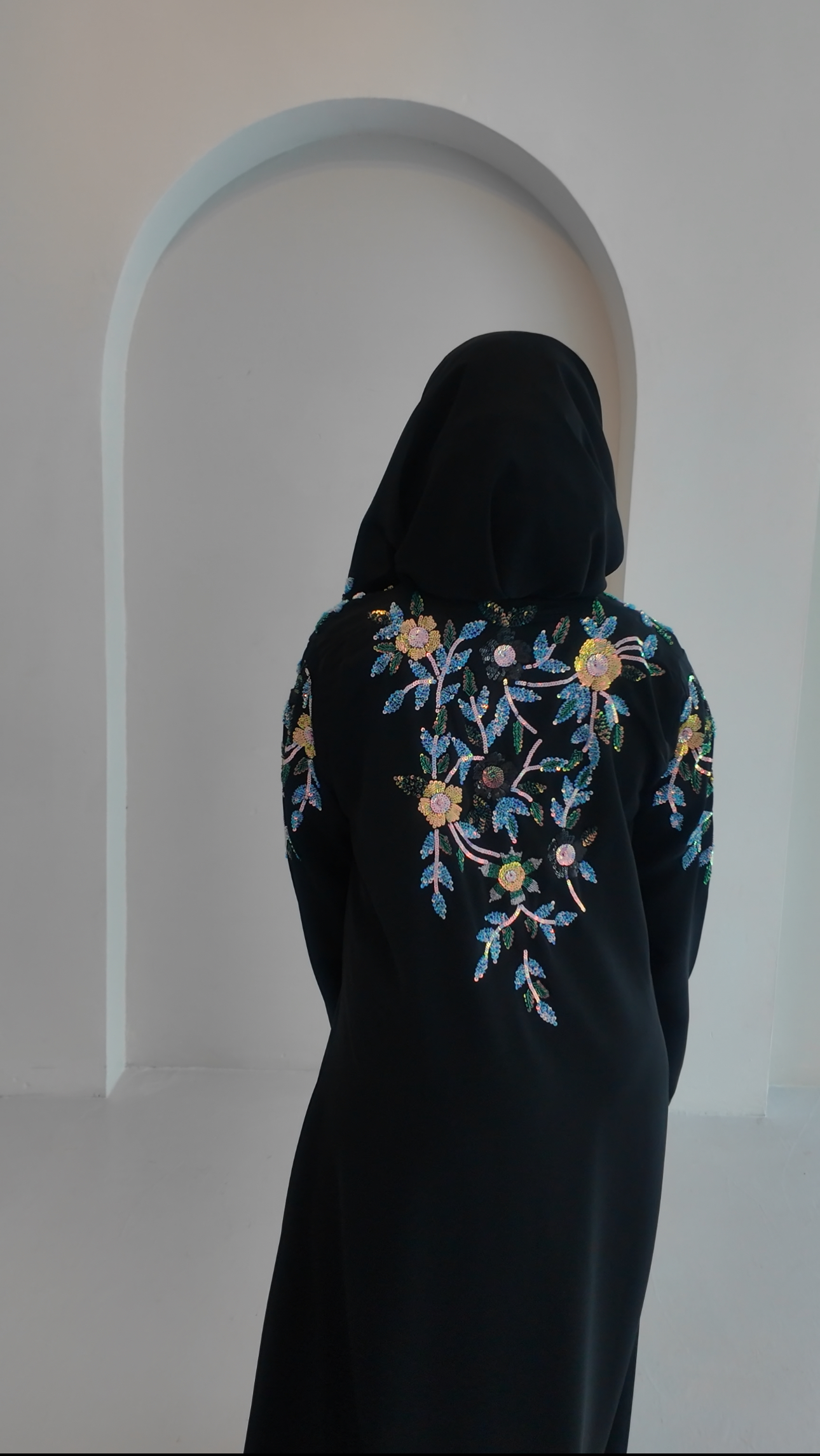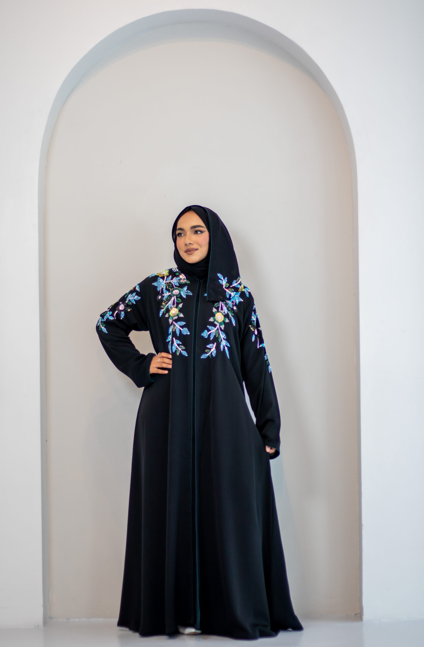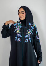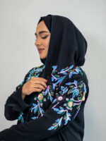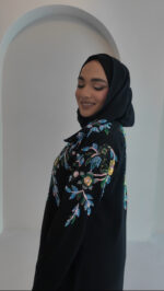 This abaya is designed by Black Rose and made in premium Nida fabric. It features hand sequin work on the front, shoulders, sleeves, and back. The colours are inspired by peacock feather shades, giving it a rich and elegant look.