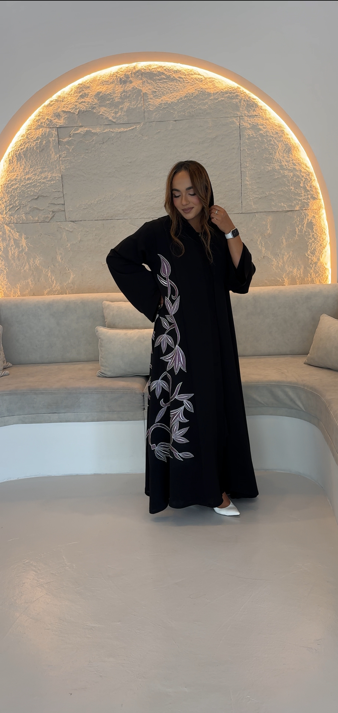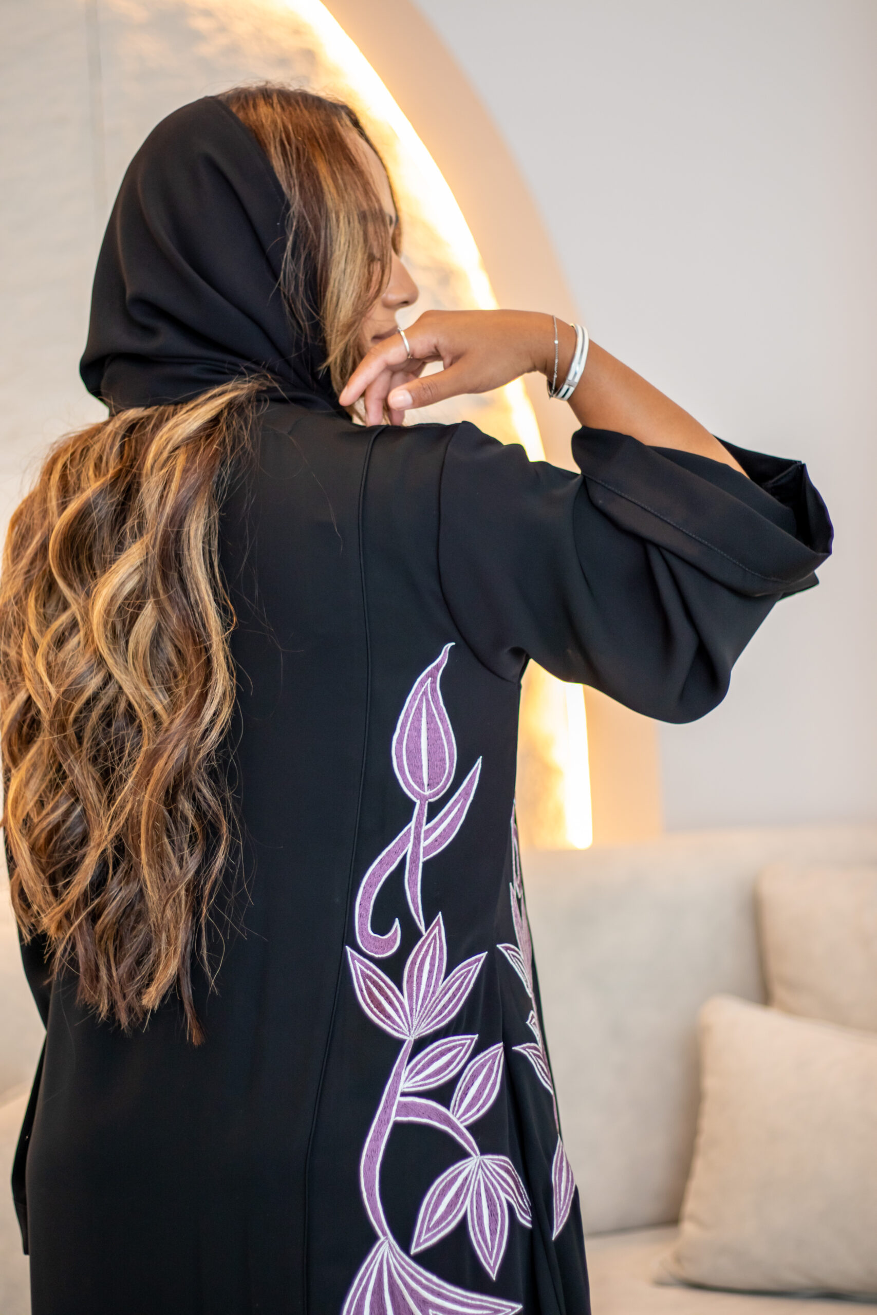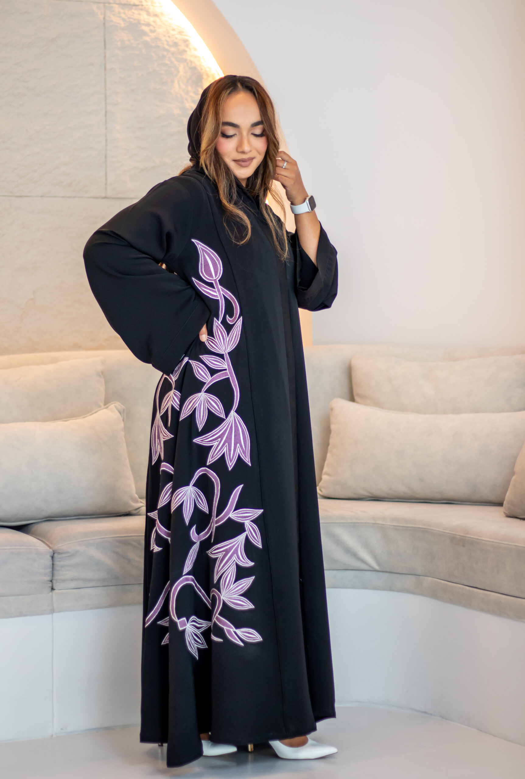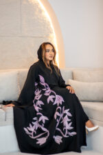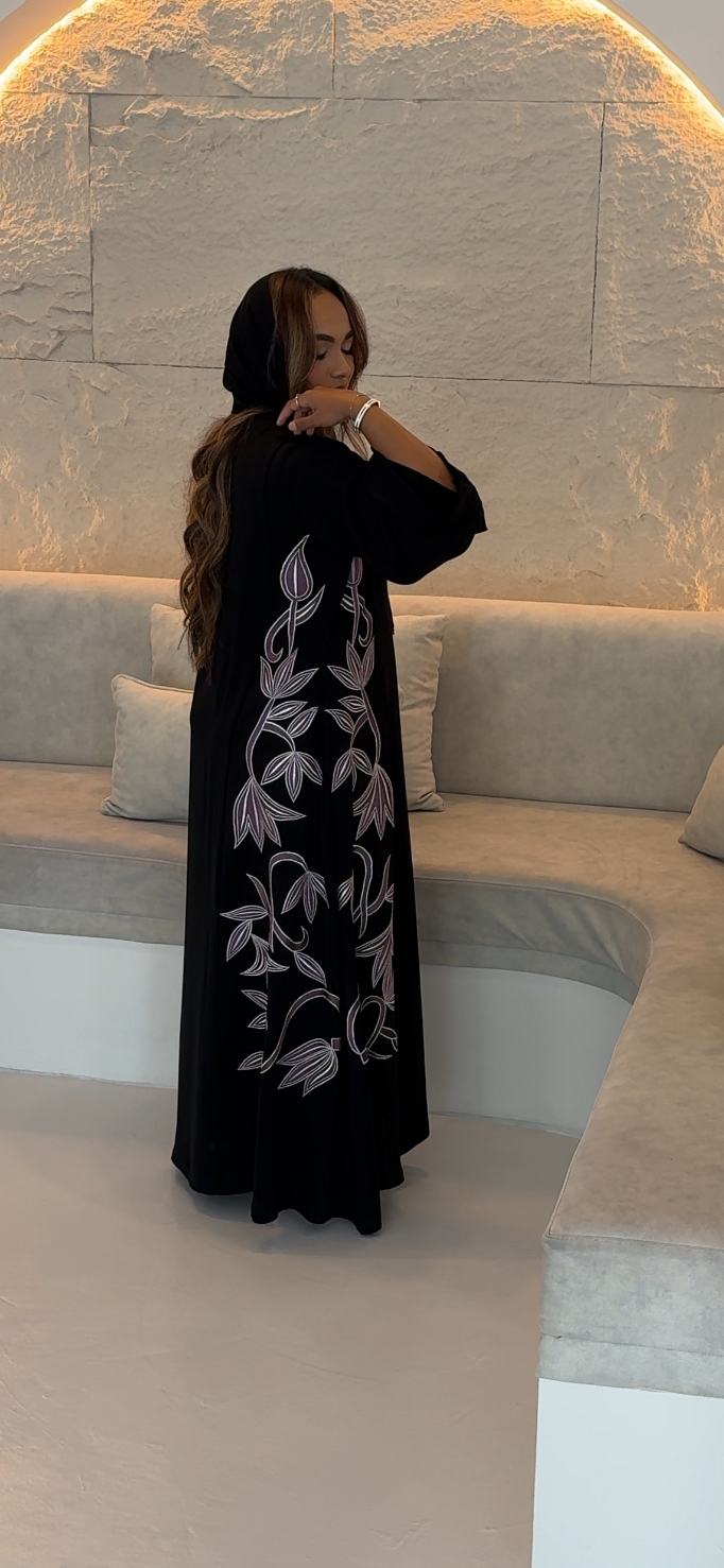 This abaya has mauve embroidery with a white outline. The leaf and vine design starts from the bottom and flows up, giving it a soft and elegant look. Subtle, graceful, and easy to wear.