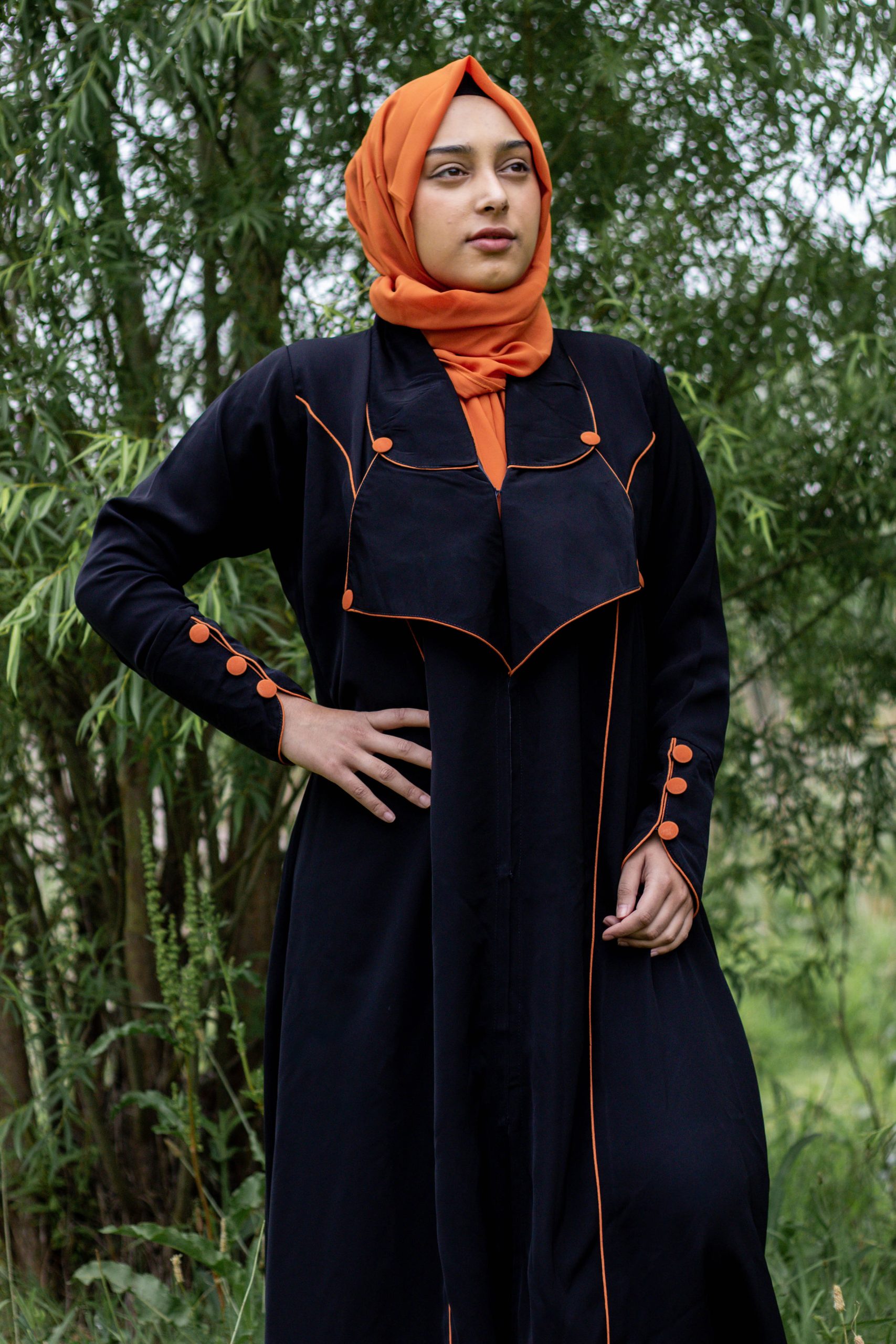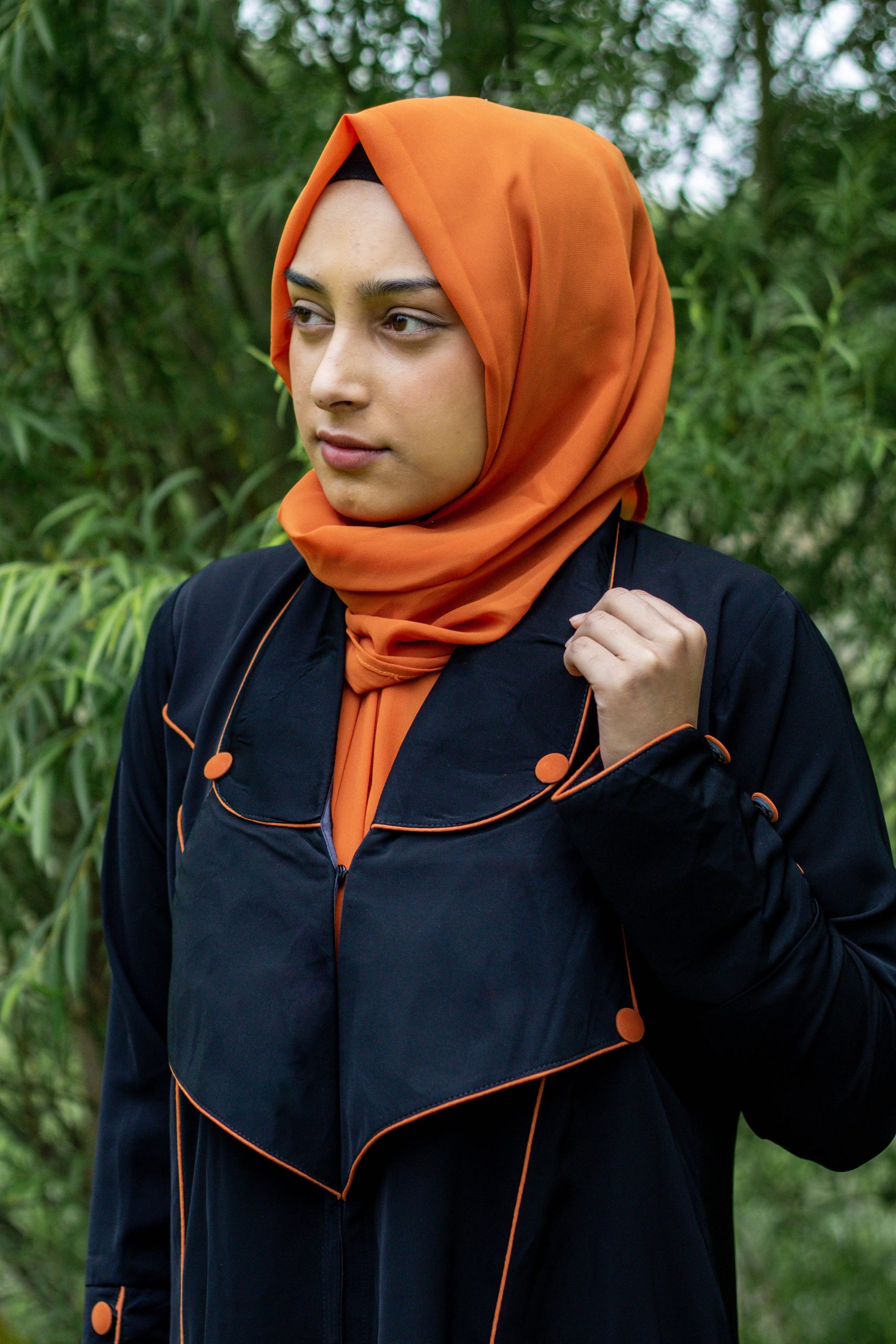The subtle touch of orange adds warmth and a contemporary flair to your modest look. Effortless elegance in every detail.”