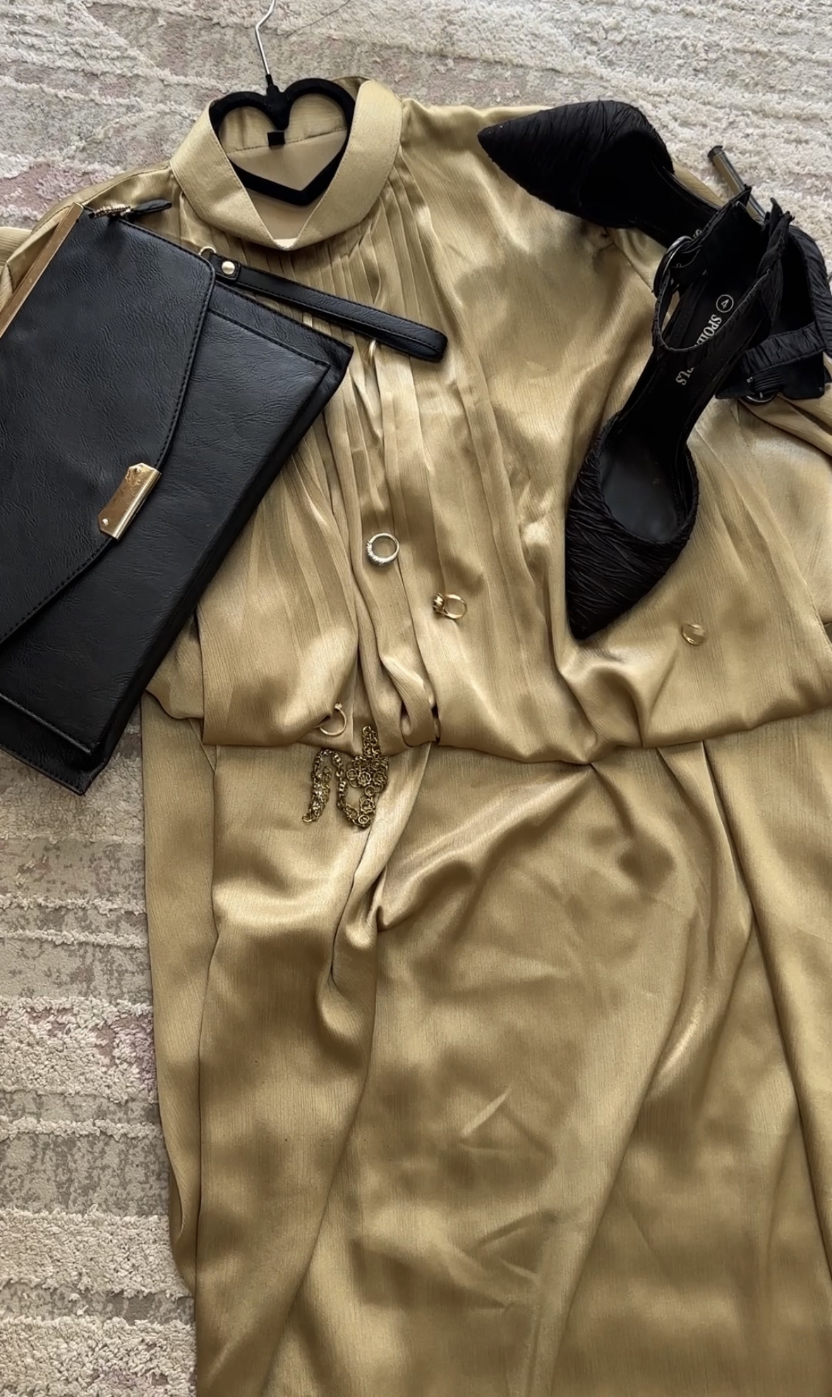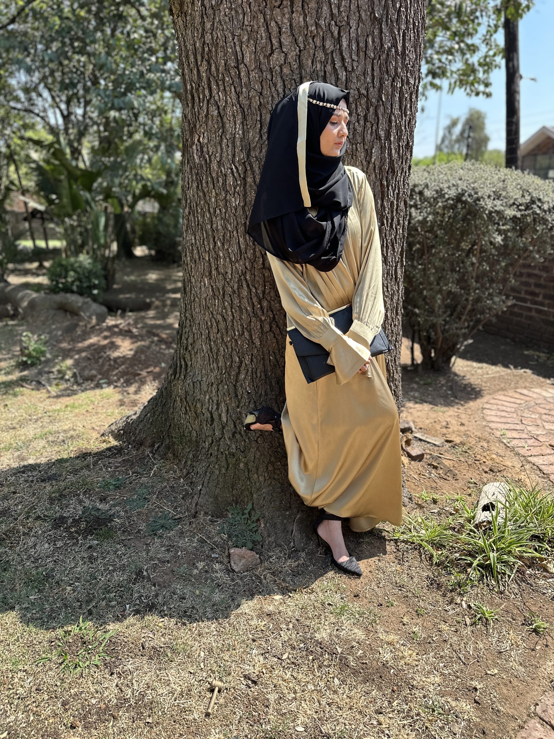 “Elegance meets shimmer, This gold abaya is the epitome of grace and sophistication. Elevate your look with Arabian hijab style and dazzling hijab accessories. Shine bright at any occasion!”
