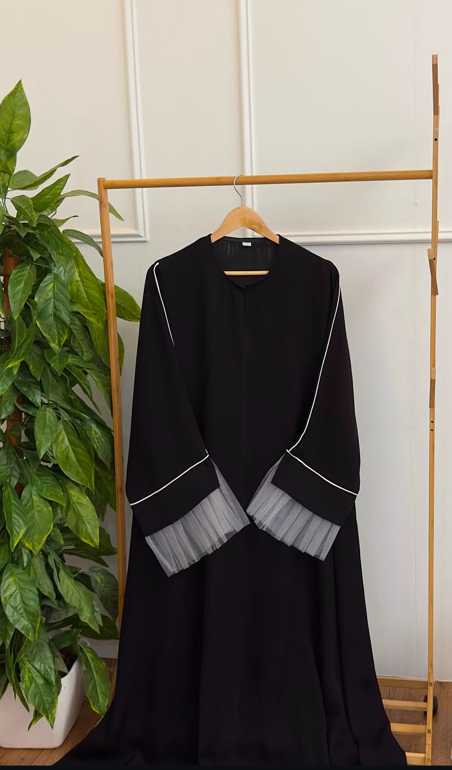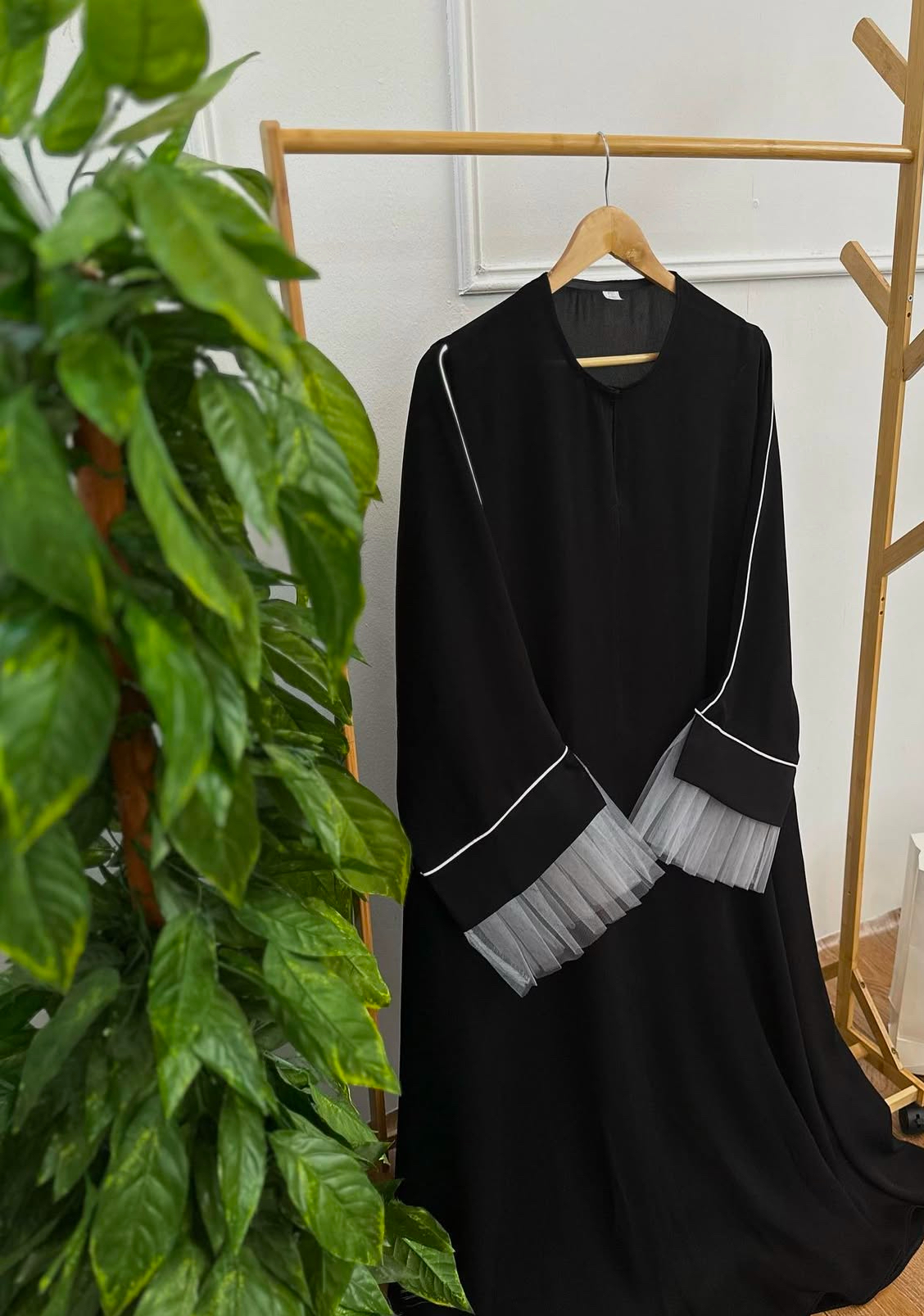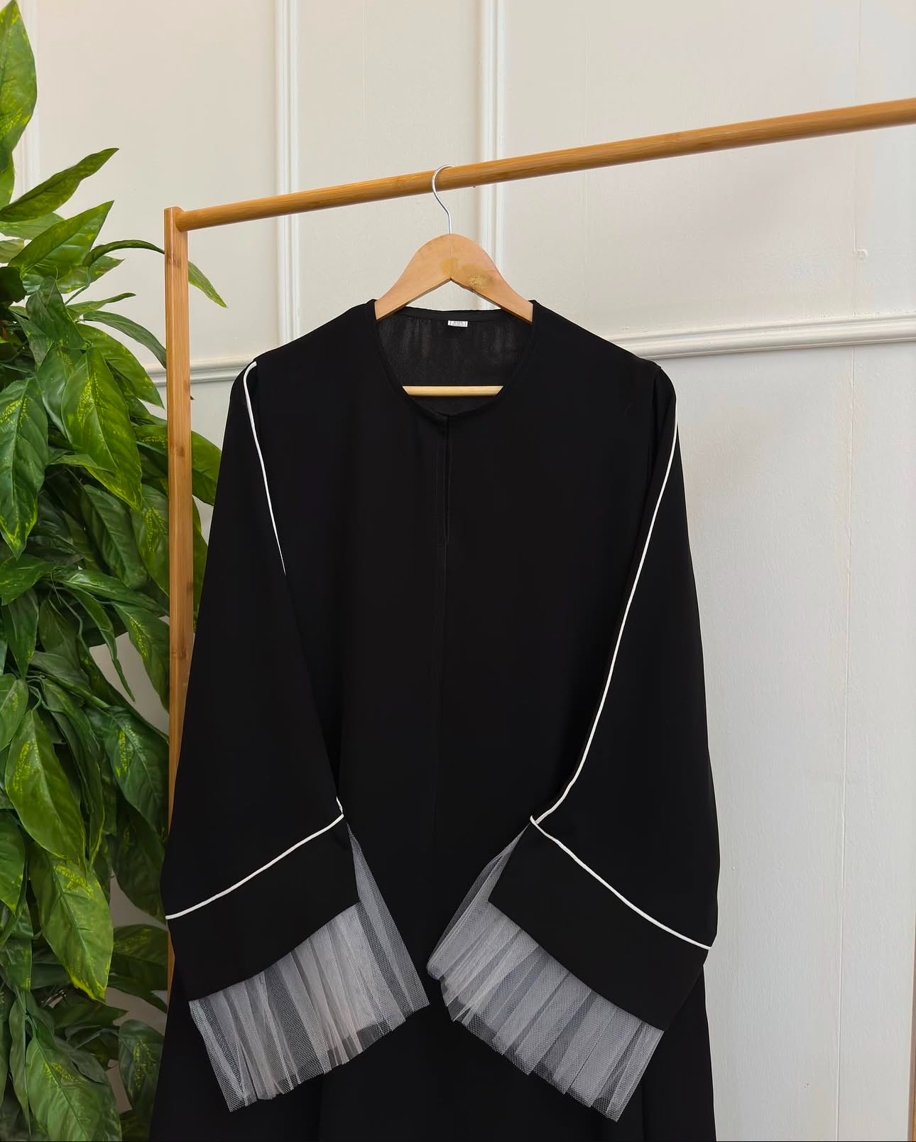 Ramadan Black Abaya with White Piping and Net Sleeves