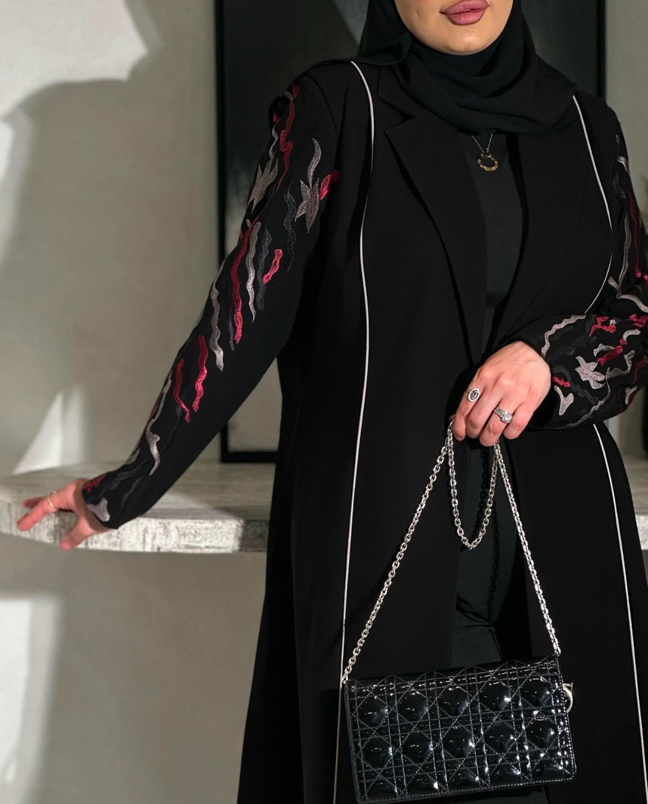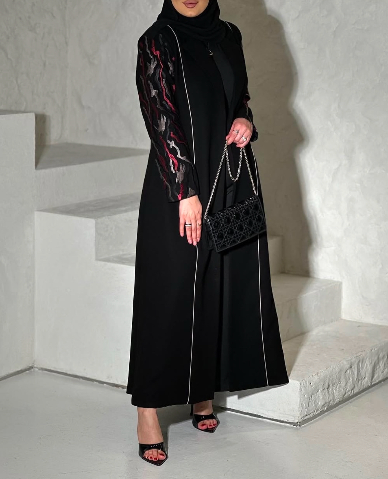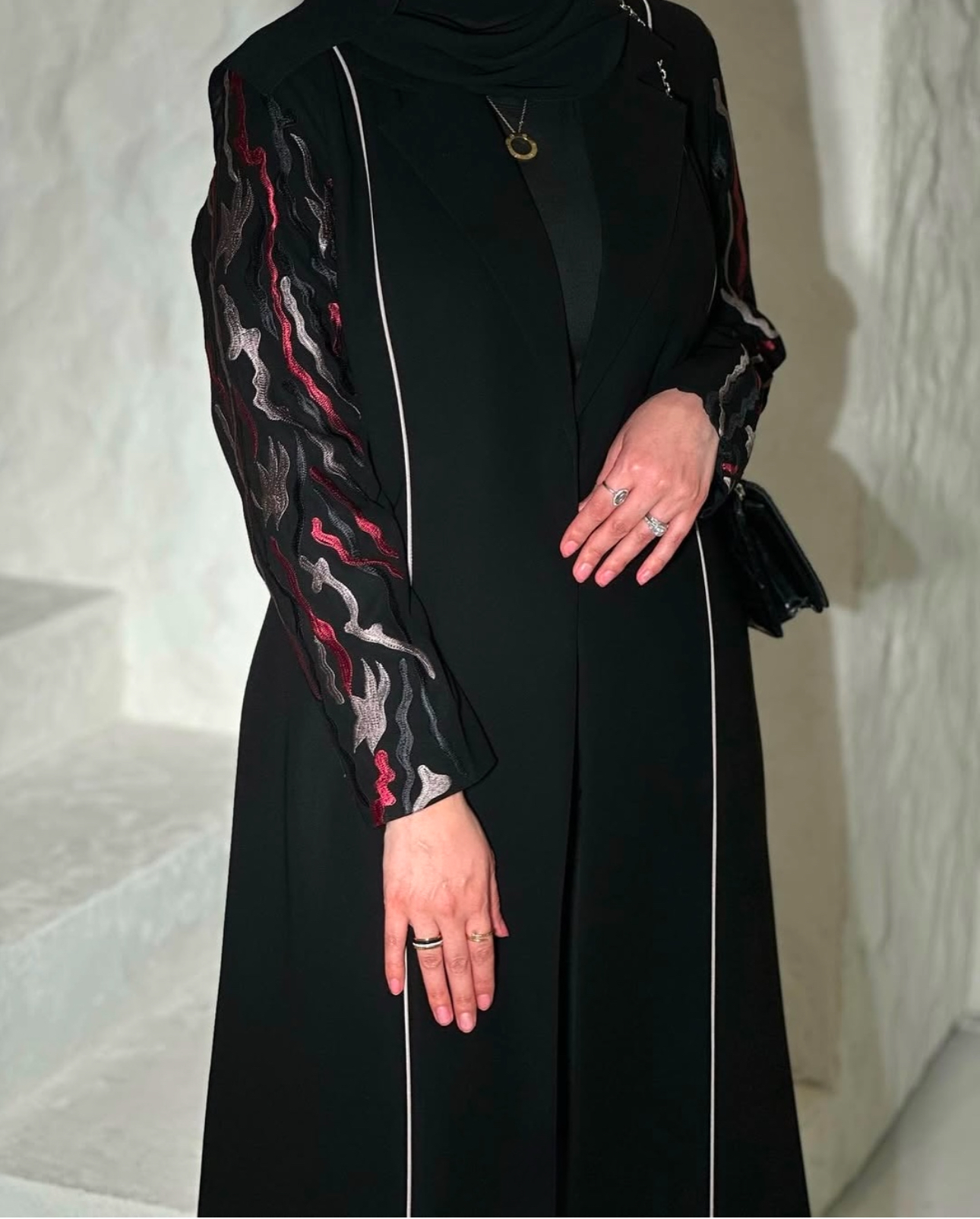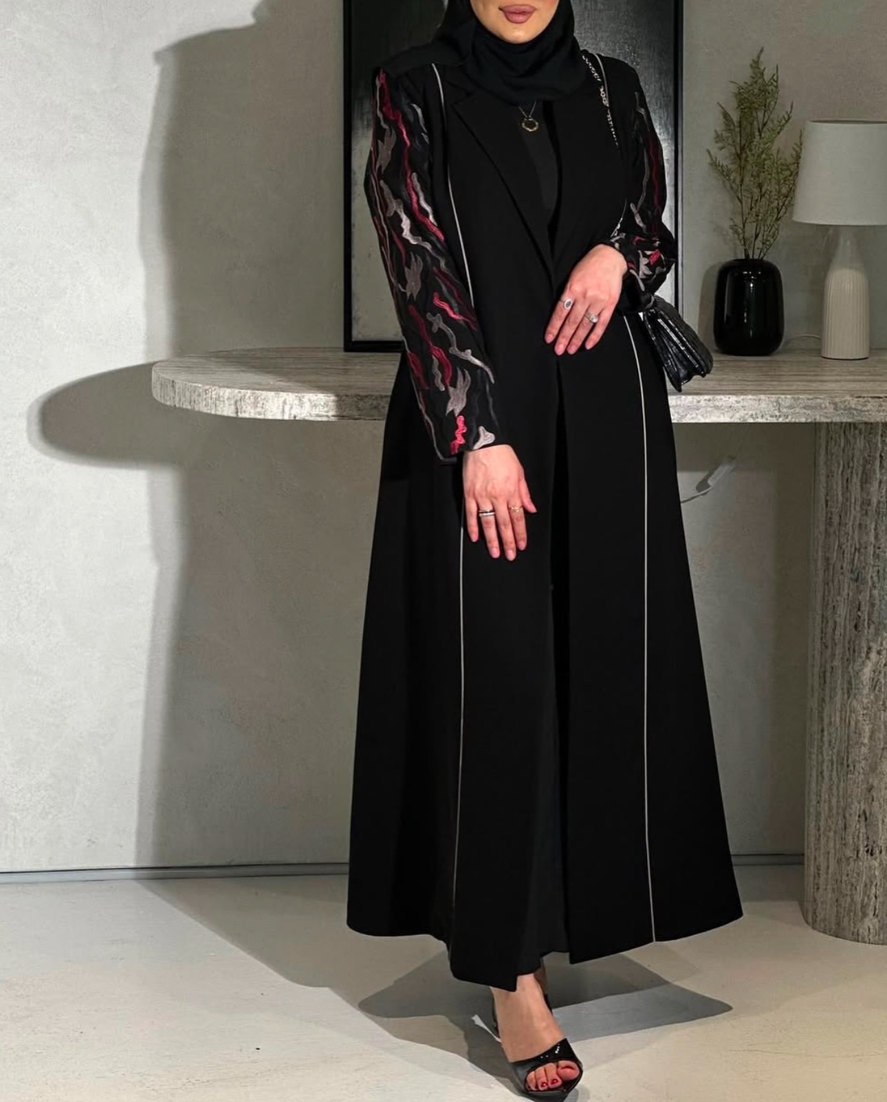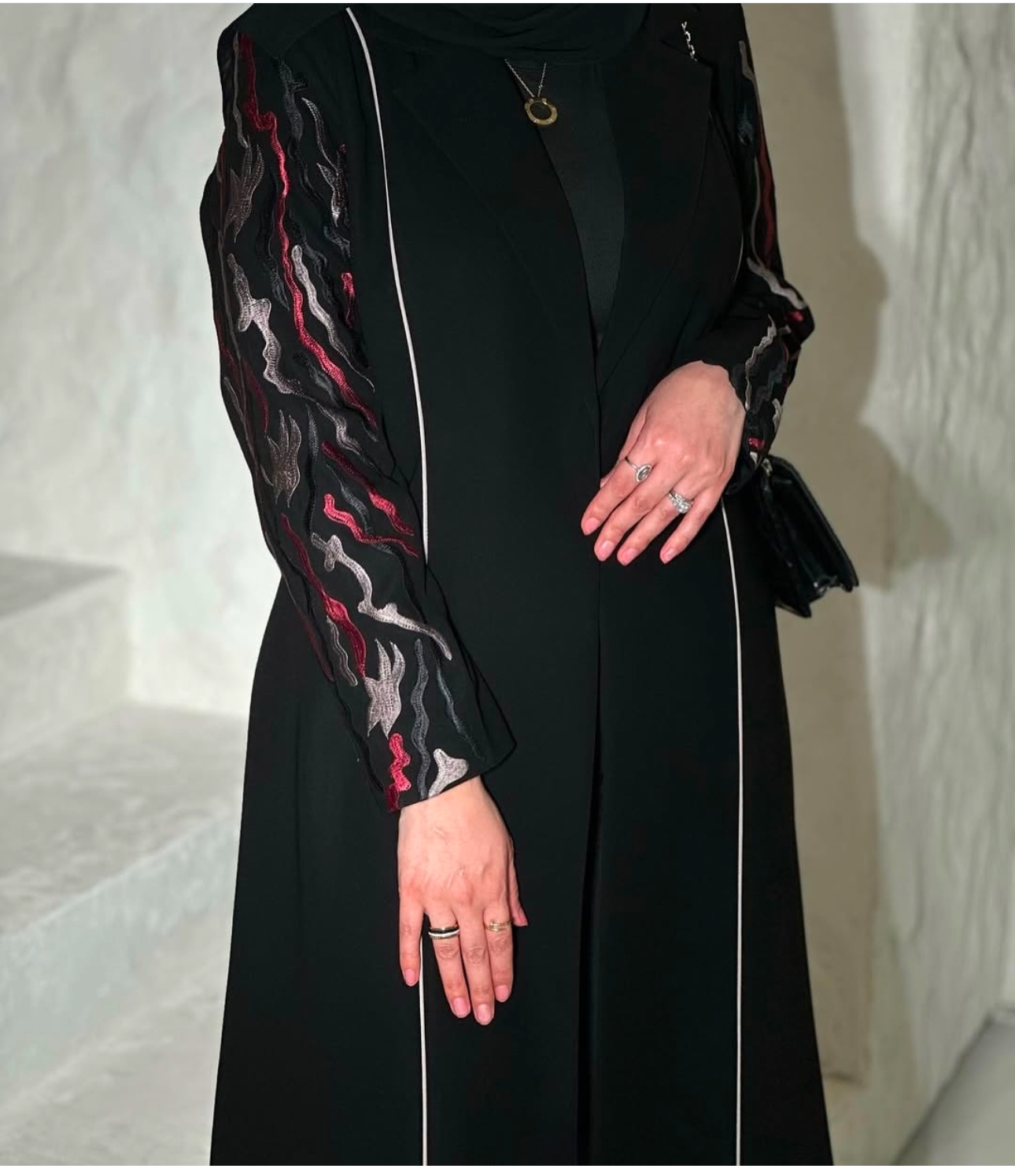 “A timeless black abaya adorned with exquisite sleeve embroidery in deep maroon, bronze, and greyish tones. The intricate detailing adds a touch of luxury, making it perfect for both formal and special occasions. Crafted from premium fabric for a graceful flow and comfortable wear, this abaya is a true statement of elegance.”