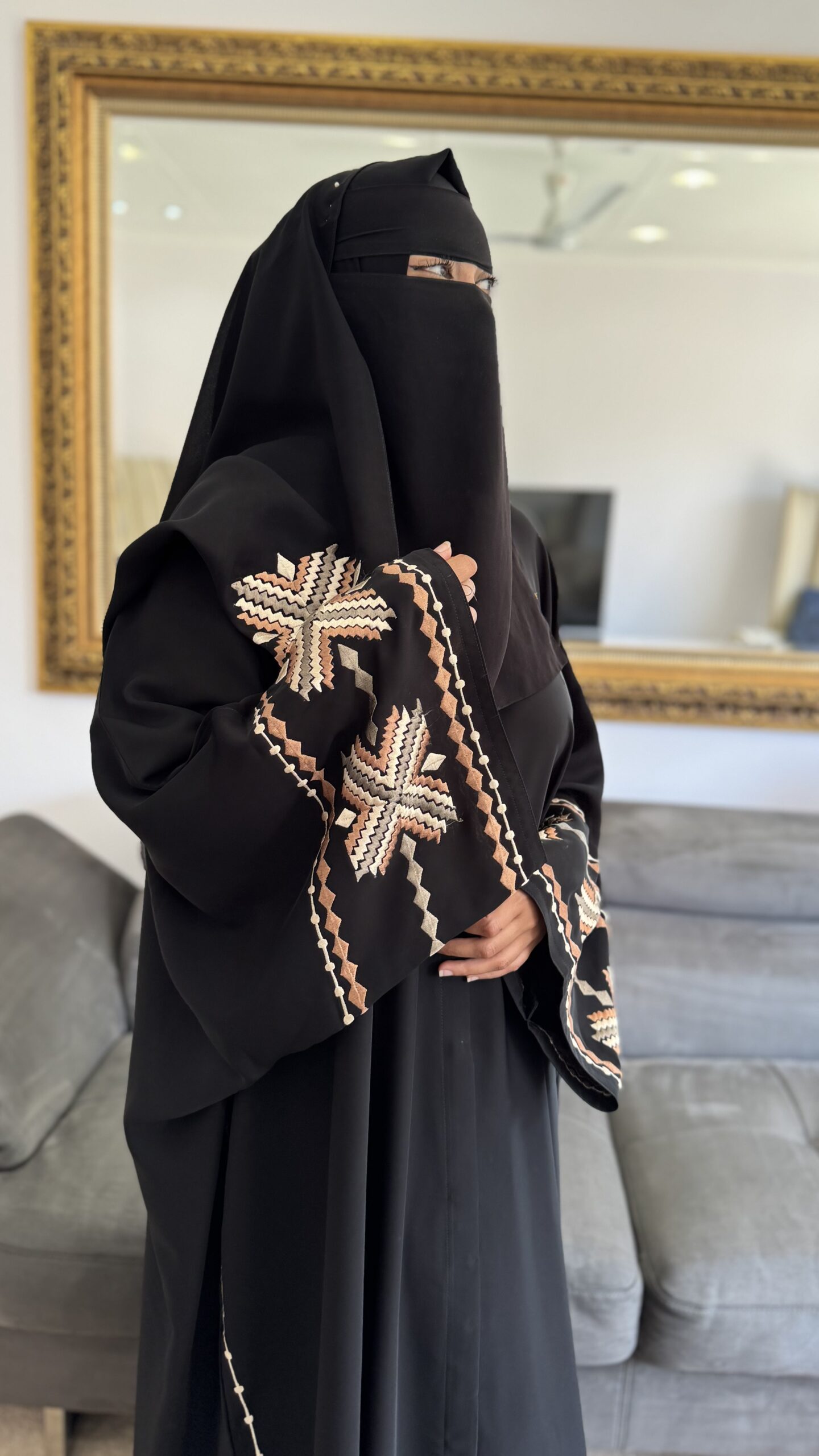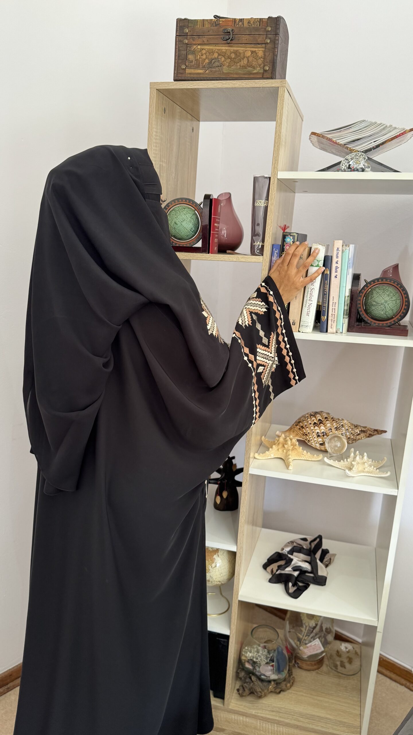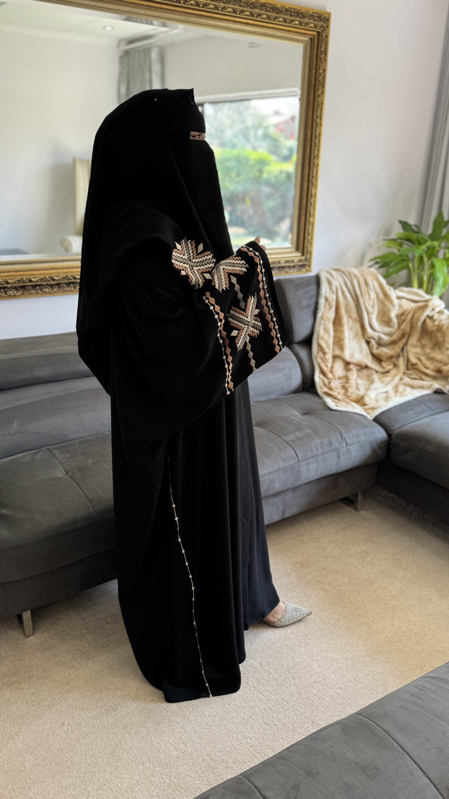 ✨ “Presenting Bronze Horizon, a flowing Farasha flare cut abaya in classic black with subtle nude and bronze-toned abstract embroidery. Worn closed, it radiates sophisticated elegance, and styled open over a satin fitted dress with heels, it becomes a striking, elevated evening look.”