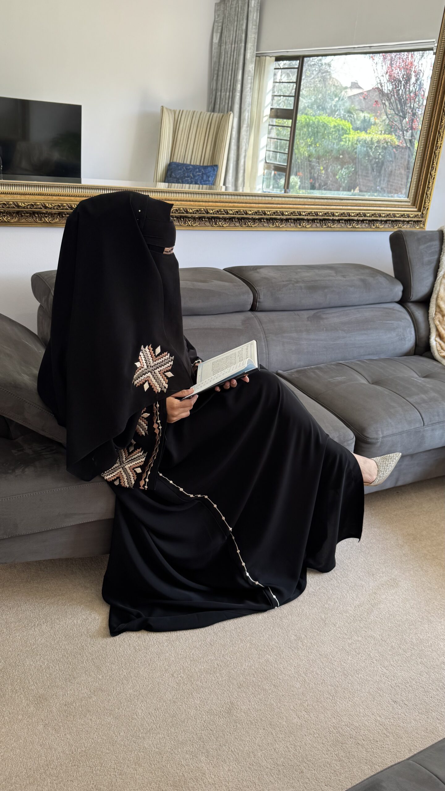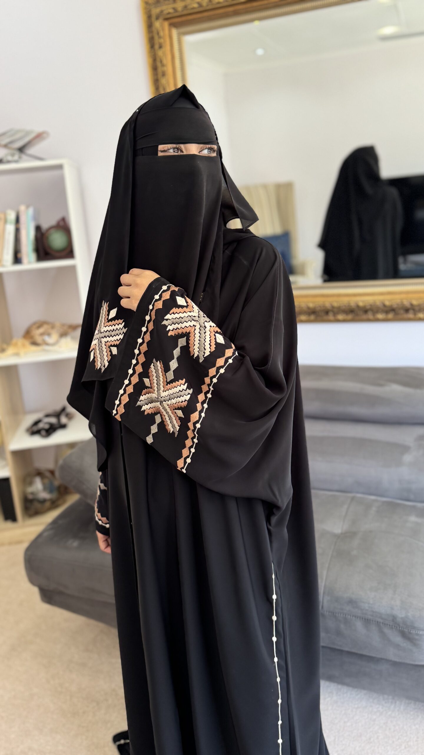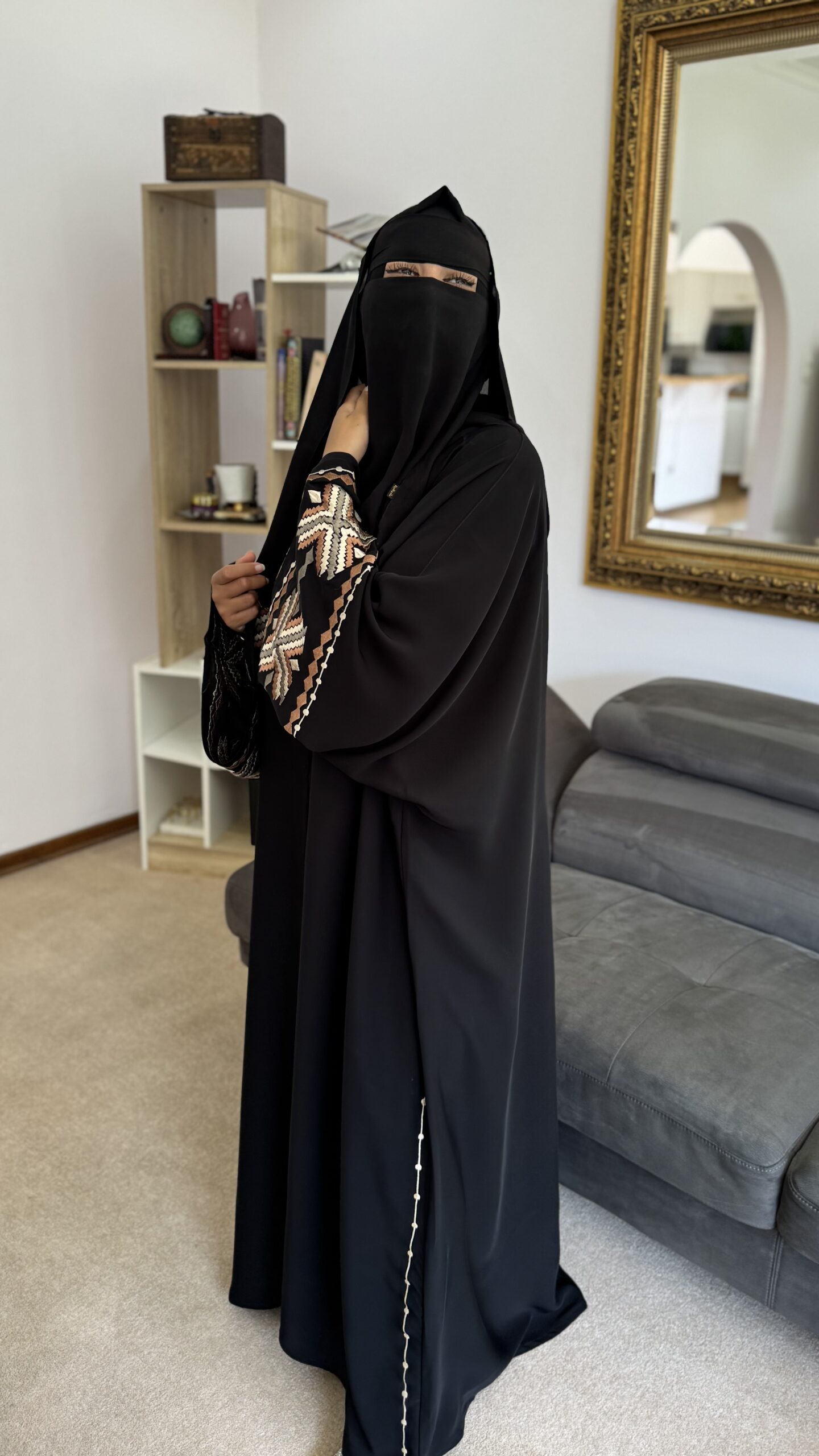 ✨ “Presenting Bronze Horizon, a flowing Farasha flare cut abaya in classic black with subtle nude and bronze-toned abstract embroidery. Worn closed, it radiates sophisticated elegance, and styled open over a satin fitted dress with heels, it becomes a striking, elevated evening look.”