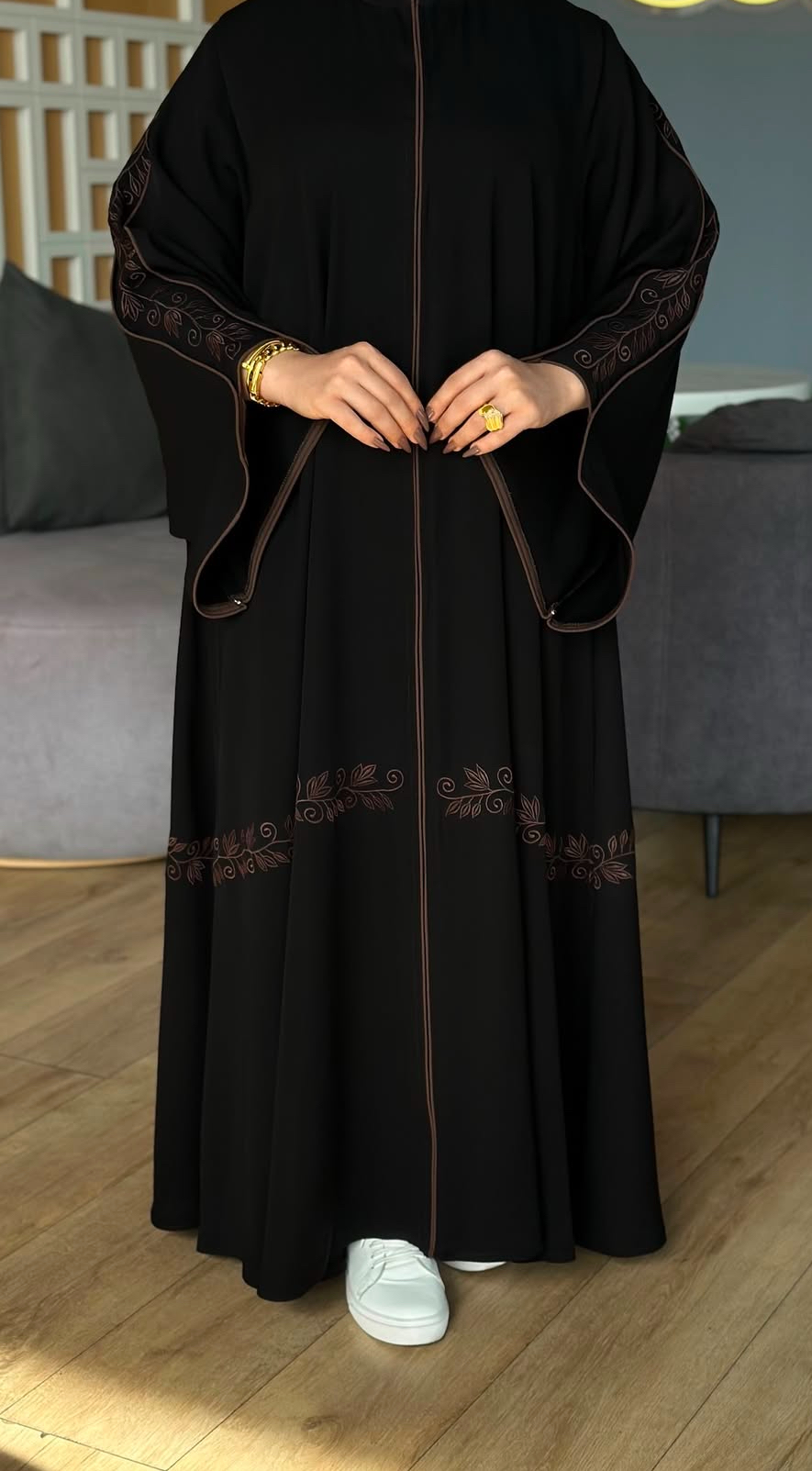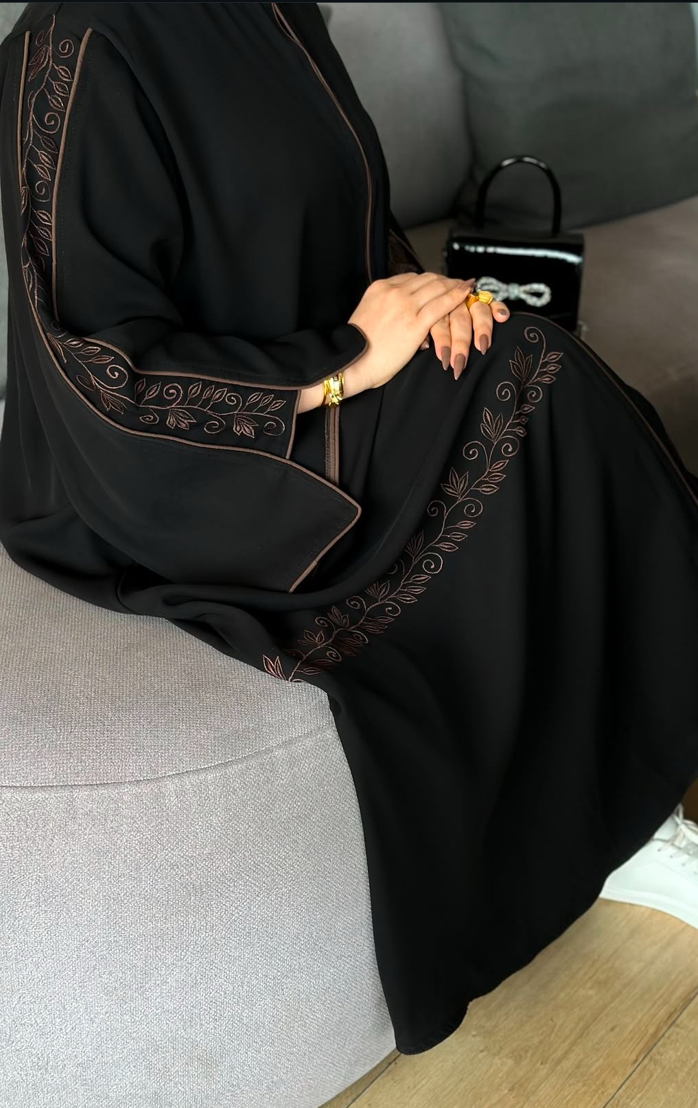 BLACK ABAYA WITH BEAUTIFUL BONZEEE EMBROIDERY FRONT AND BACK. COMES WITH SCARF.