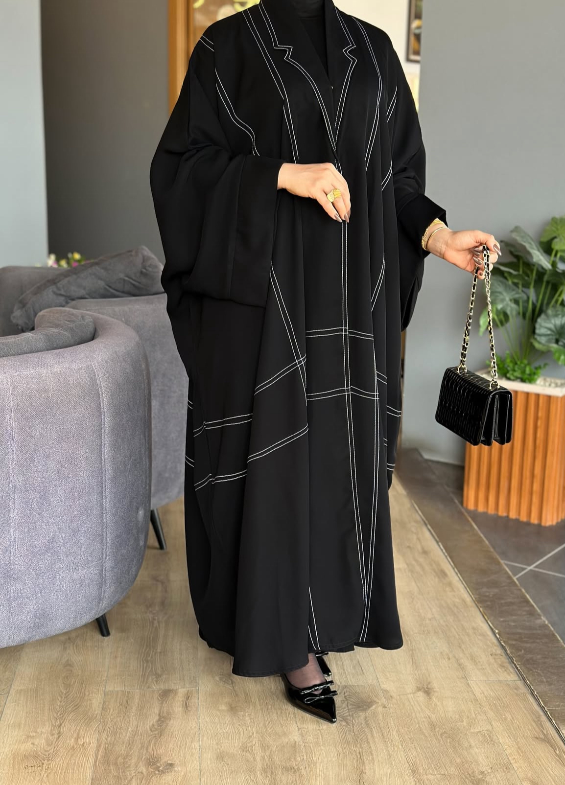 FREE SIZE NIDA ABAYA WITH PIPING DETAILS FRON AND BACK.