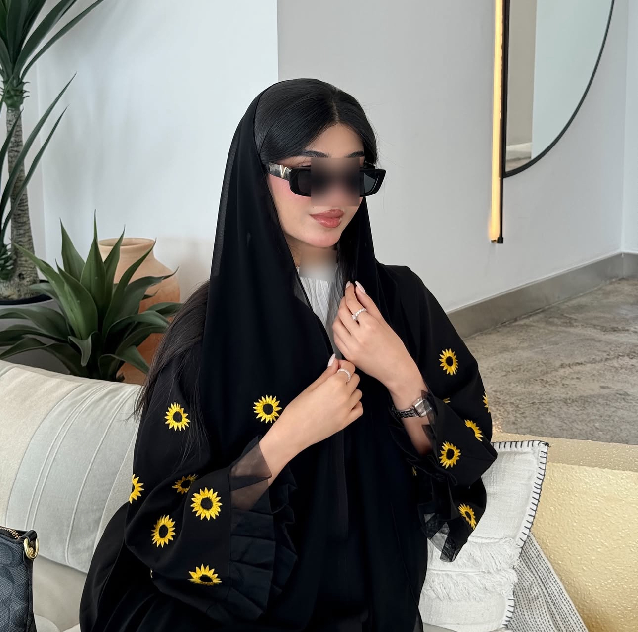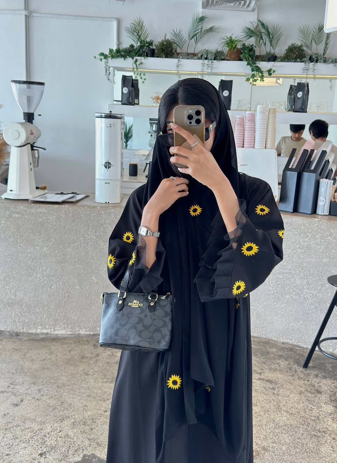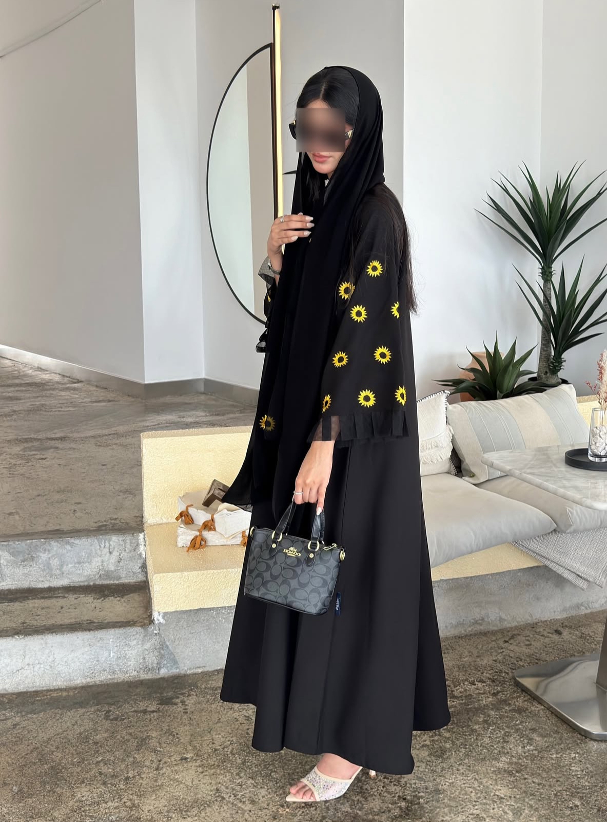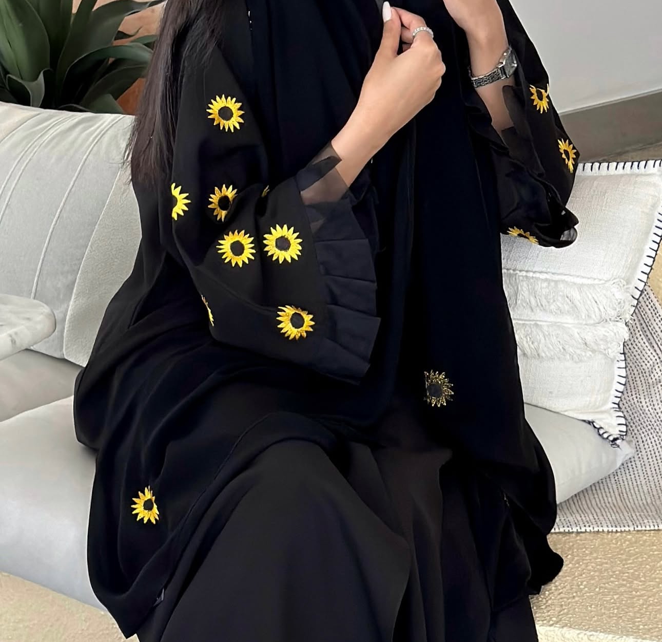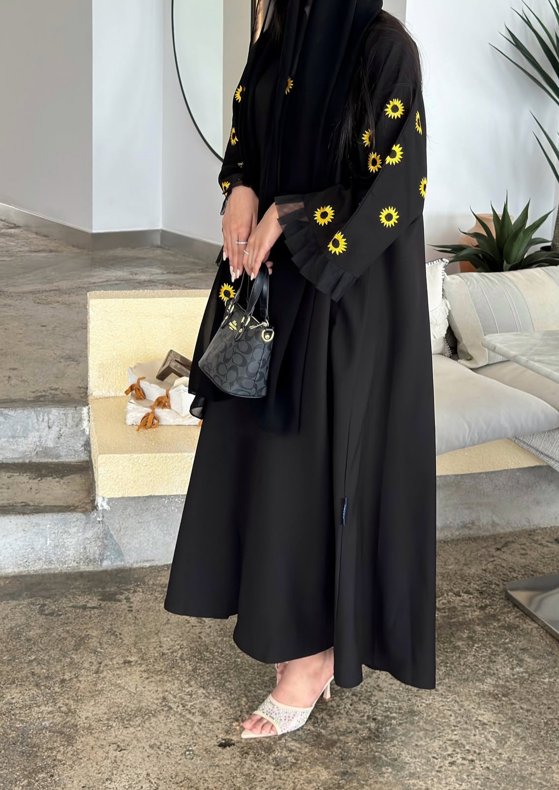 Premium Nida abaya with cute sunflower embroidered sleeves and net details.