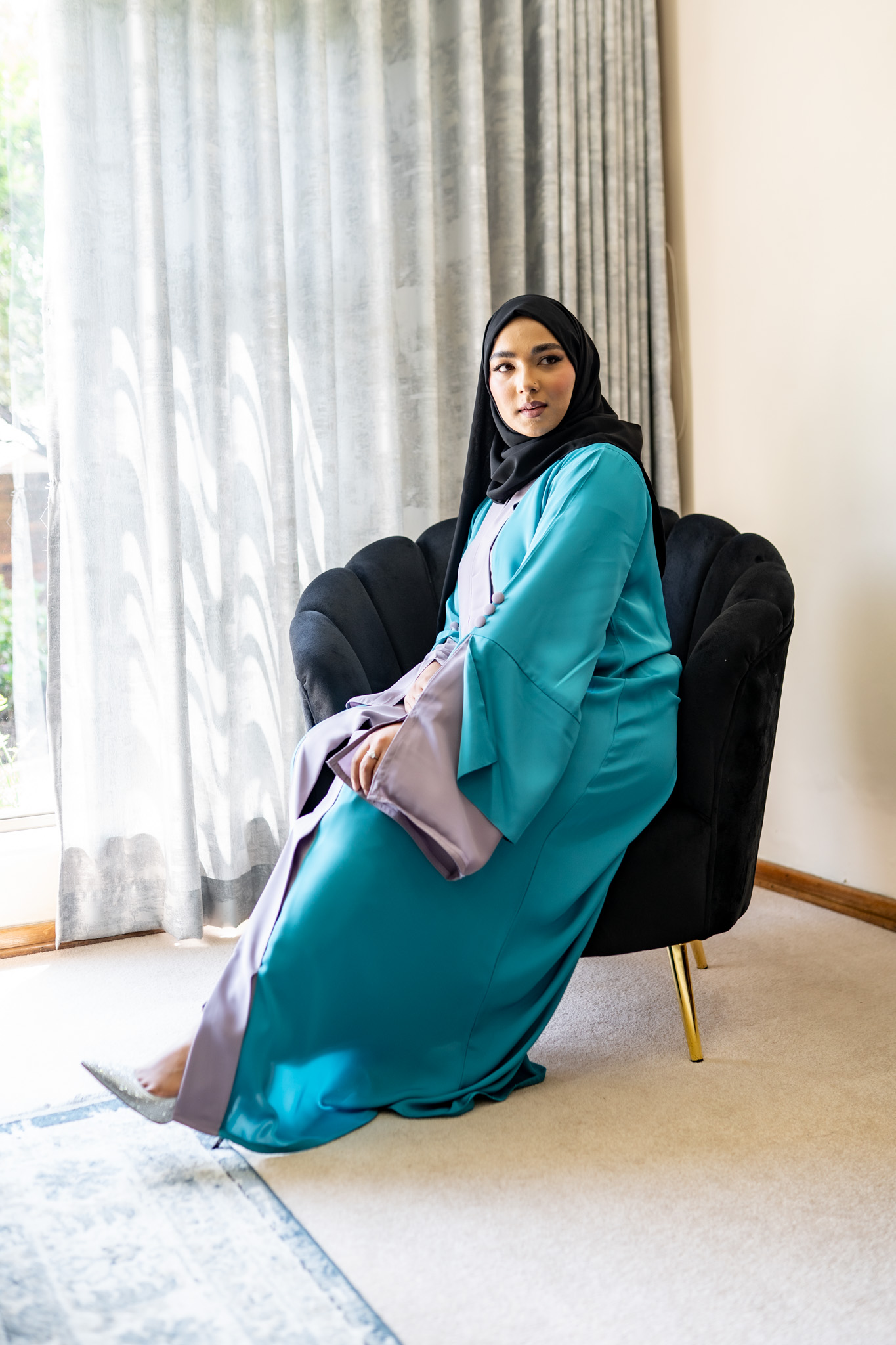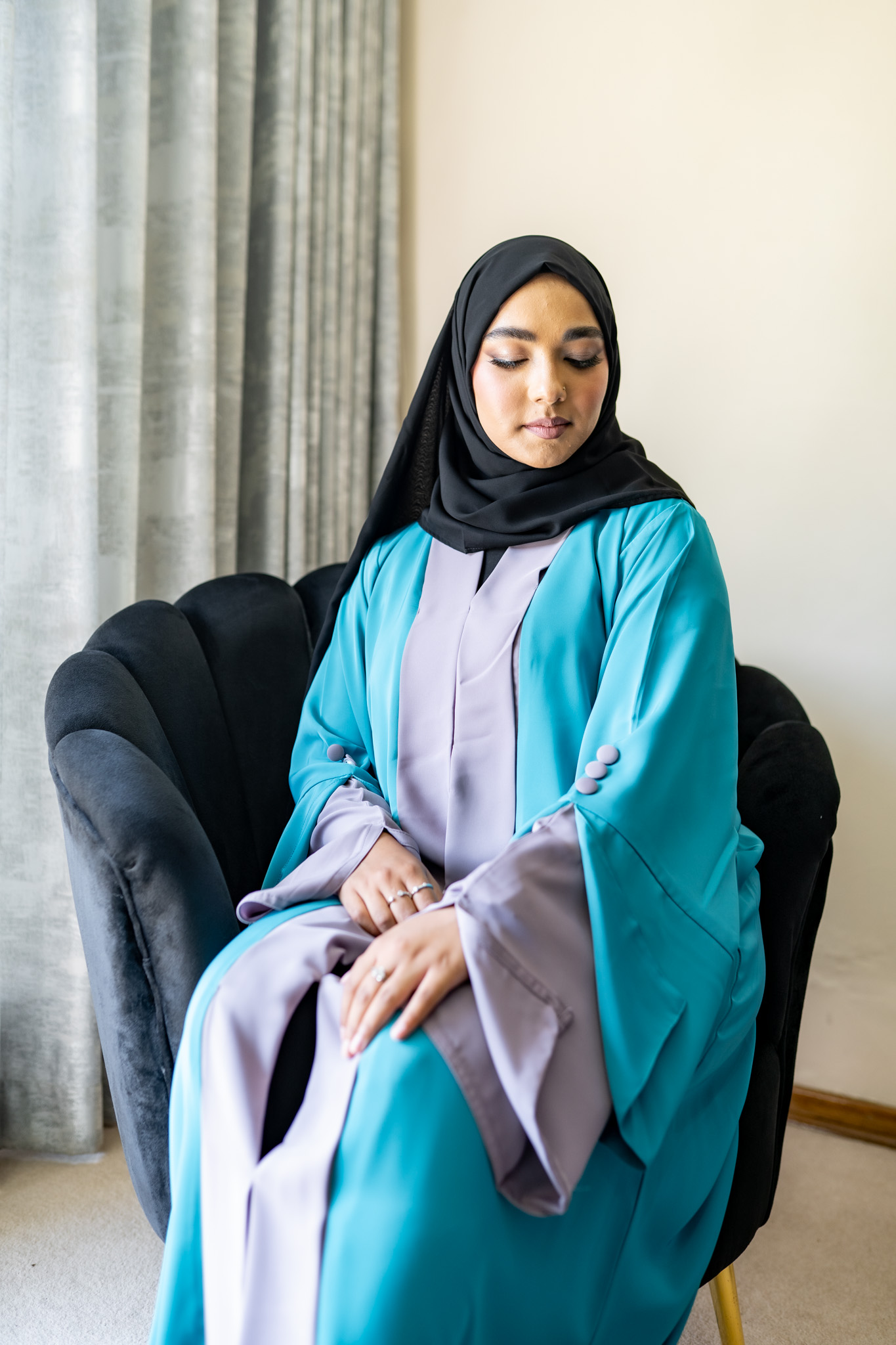 •effortlessly combines the calming tones of Cayan and the soft allure of lilac, creating a perfect balance of sophistication and elegance. Crafted from the finest Nida fabric, this piece drapes beautifully and offers a luxurious feel. The button details on the sleeves add a touch of refinement and contemporary flair. Ideal for both casual and formal settings, this abaya exudes timeless elegance and modern charm, making it a standout addition to any wardrobe.