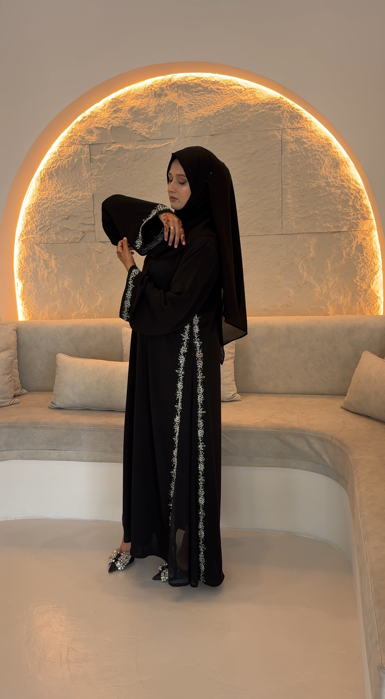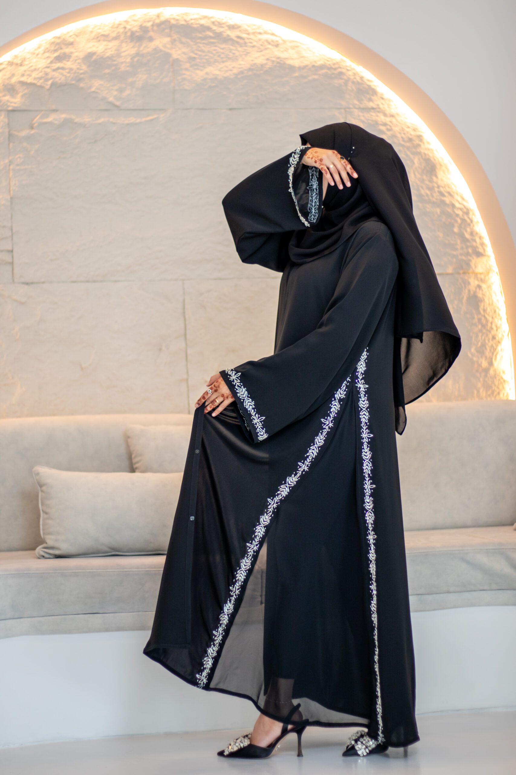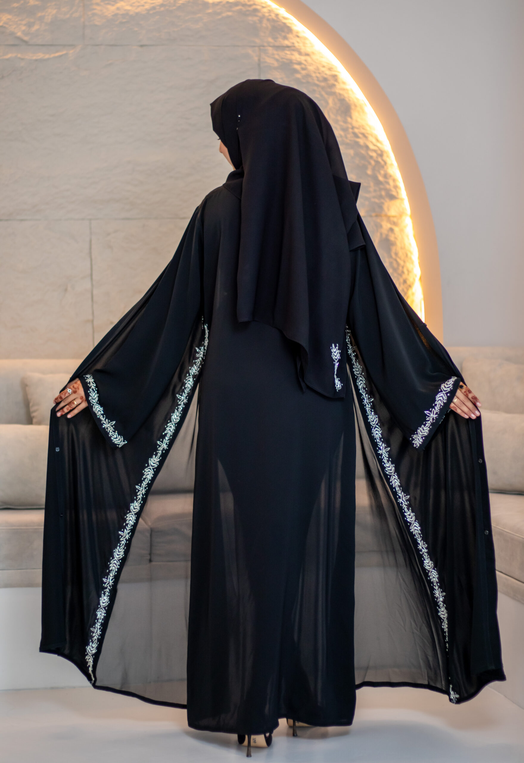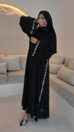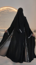 This premium Nida abaya has side chiffon panels that give a flattering princess-style flow. The edges of the panels are finished with delicate silver work, and the sleeves feature silver hand-beaded detailing. Elegant, lightweight, and perfect for a graceful look.